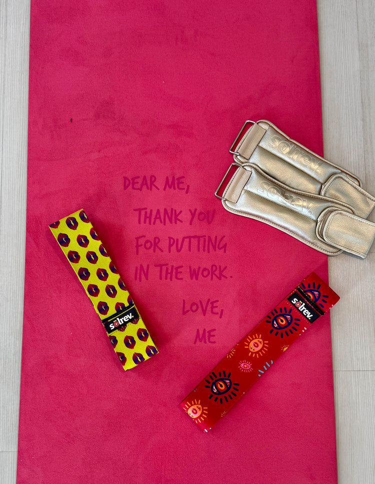 Pop art meets glute training with the KISS MY ASS Heavy Resistance Booty Bands from Solrev fitness studios. Booty bands are a kick-butt tool for at-home and gym training. Made from the highest quality materials, these bands won't snap, roll, or irritate the skin. Throw them on above your knees, lateral walk, squat, bridge, hip thrust, kick back and more!