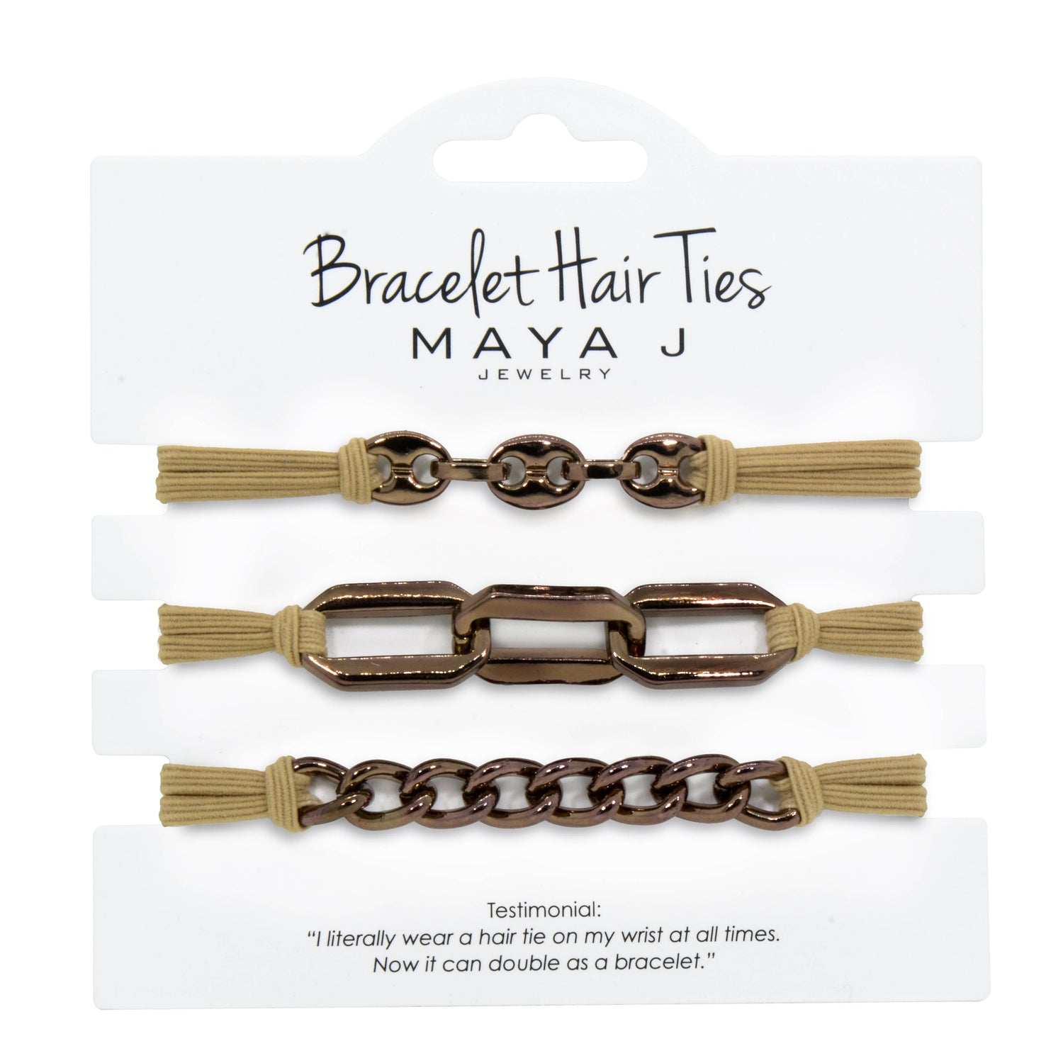 One of Oprah's favorite things 2022! Maya J Jewelry takes two things we love to wear on our wrists, hair ties and trendy bracelets, and combines them into one fashionable jewelry accessory - Bracelet Hair Ties! It’s a piece that everyone is sure to love and actually use, easily mixed and matched with other bracelets you already own. At an affordable price, it’s great for all ages, arriving on a beautiful card of three designs. You’ll soon want to wear one on your wrist at all times! Thoughtfully crafted with high-quality, plated brass and elastic, these sets are perfect for gifting on special occasions. Great for birthdays, stocking stuffers, white elephant gifts, hostess gifts and any winter season celebrations!