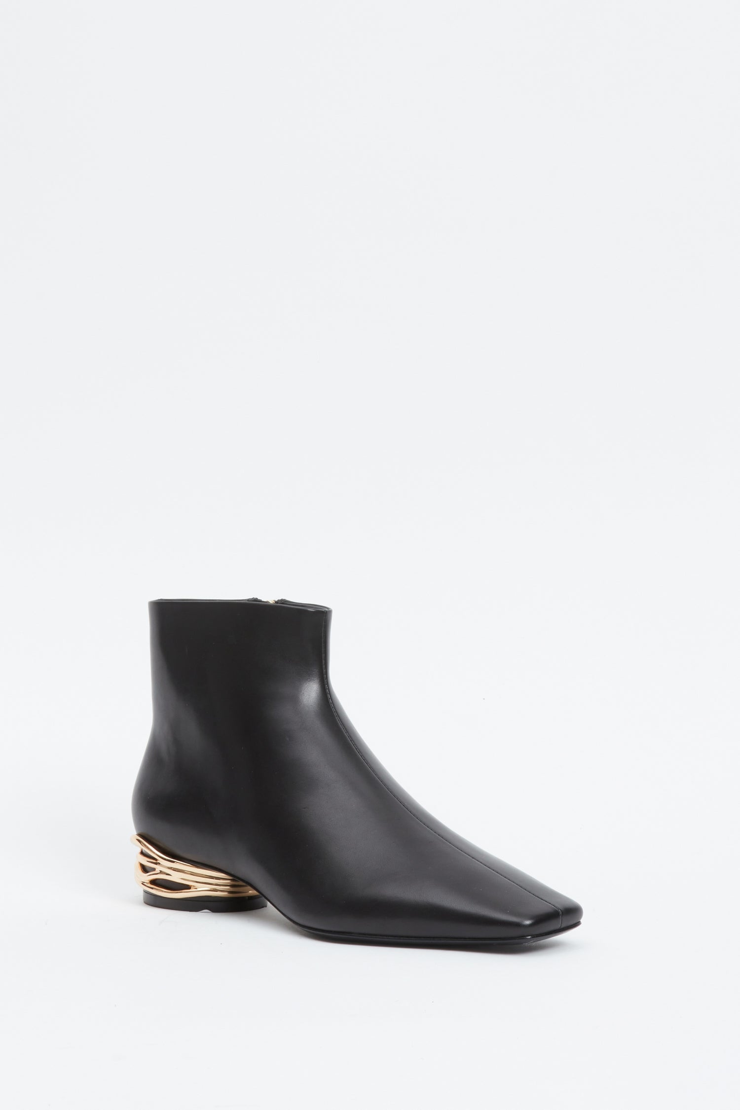 Featuring a sleek silhouette and block gold heel, these leather booties offer both style and comfort for any occasion.