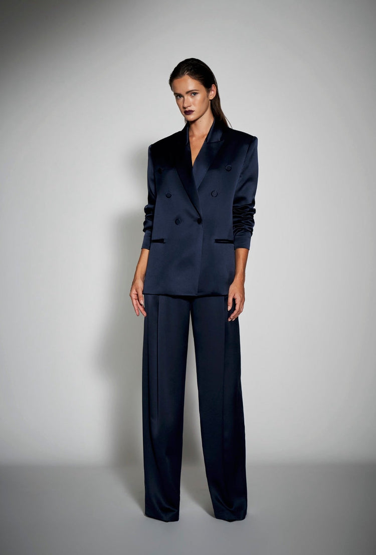 Double breasted blazer in silk charmeuse with with front pockets. Fully lined with self covered button closure.