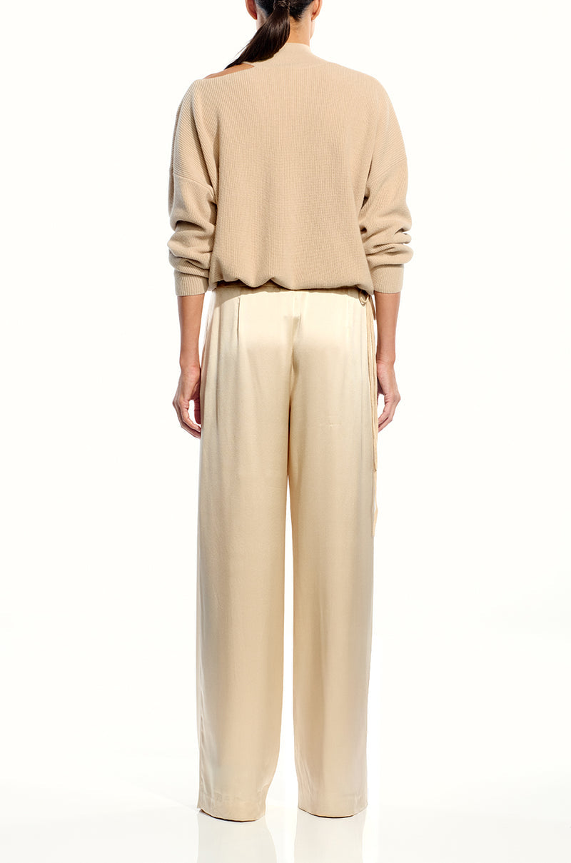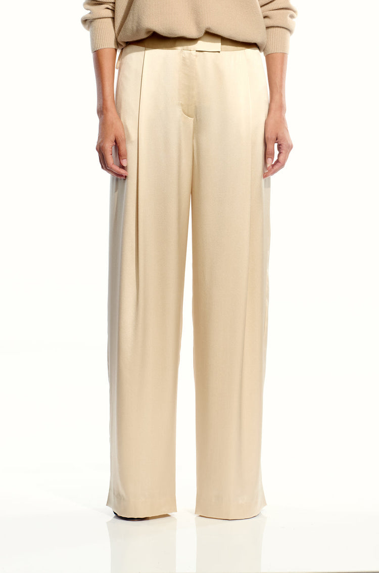 Mid waisted relaxed wide leg trouser in silk charmeuse with pleating detail. Hidden pockets at side seams with center front fly and hook and bar closure. Imported.