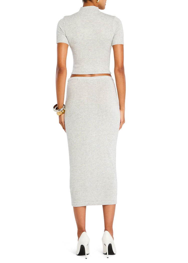 Tea length knit skirt. Pair with our Kali Knit Top for a co-ord look. Shown here in Light Grey.