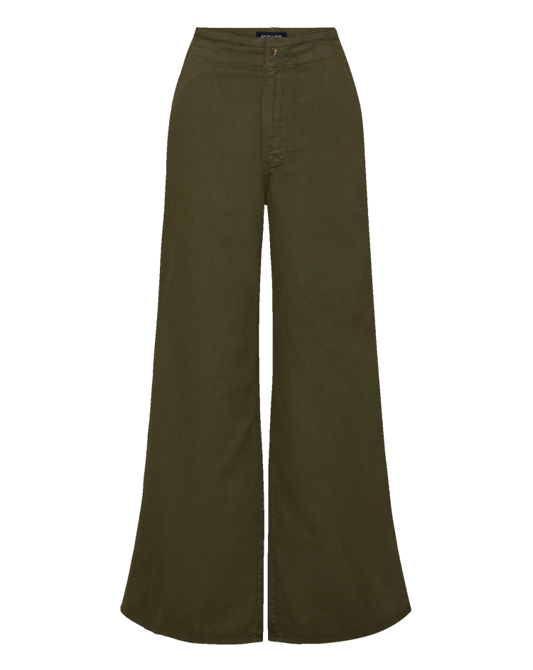 Made in LA from stretch cotton twill, the Kasey pant in army green is a mid-rise, wide-leg silhouette with a clean, flat front and an elastic waistband in the back. Side slip pockets and back welt pockets complete the look. Pair with a tonal button-down or wear with the coordinating Stephen bomber for a matching-set moment.
