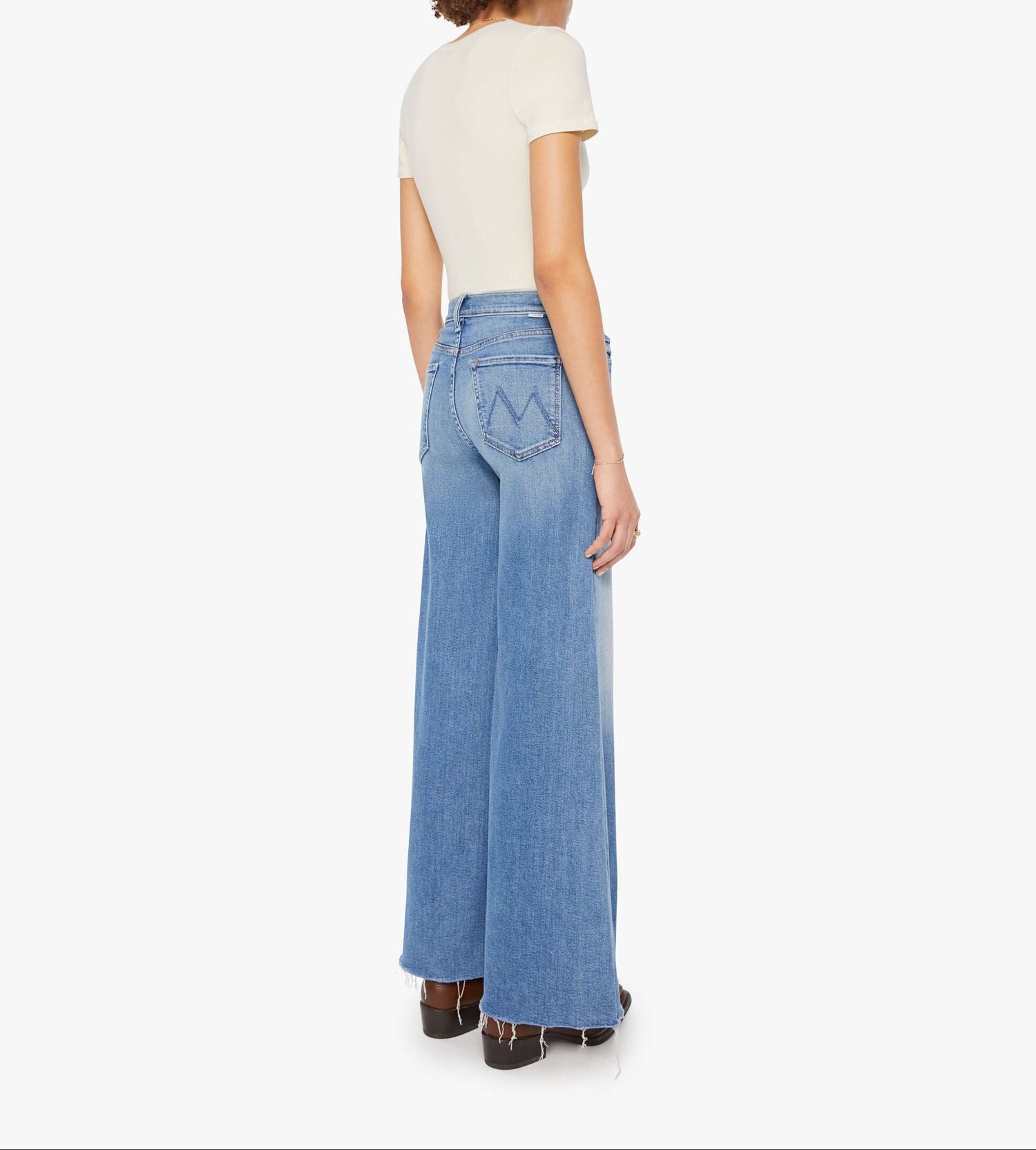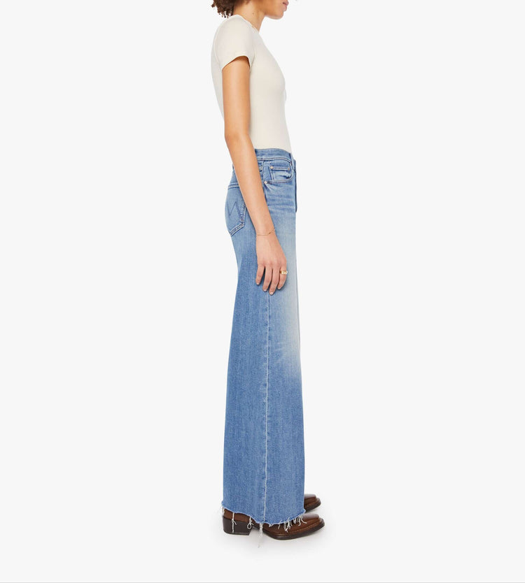On a roll. High-waisted wide-leg jeans with a button fly, long 32-inch inseam and a frayed hem. Cut from stretch denim, Poppin' Wheelies is a mid-blue with whiskering and fading at the knees.