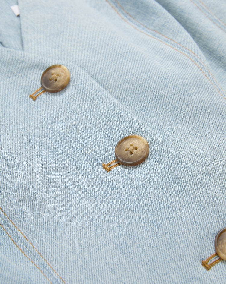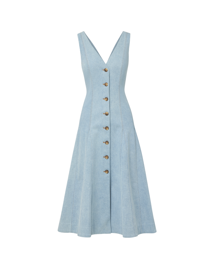 The essential summer dress—now in light-wash denim. The Lou features a fitted A-line silhouette with a pleated, midi-length circle skirt. Elongated seams define the waist, while a V neckline and faux buttoned placket—accented with tortoiseshell buttons—complete the look. Pair with strappy sandals for polished ease.