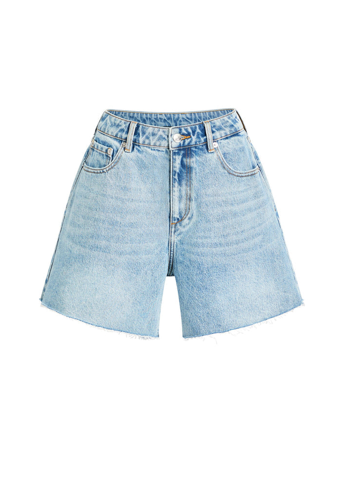 Low rise, baggy boyfriend style denim short. Shown here in Coastline.