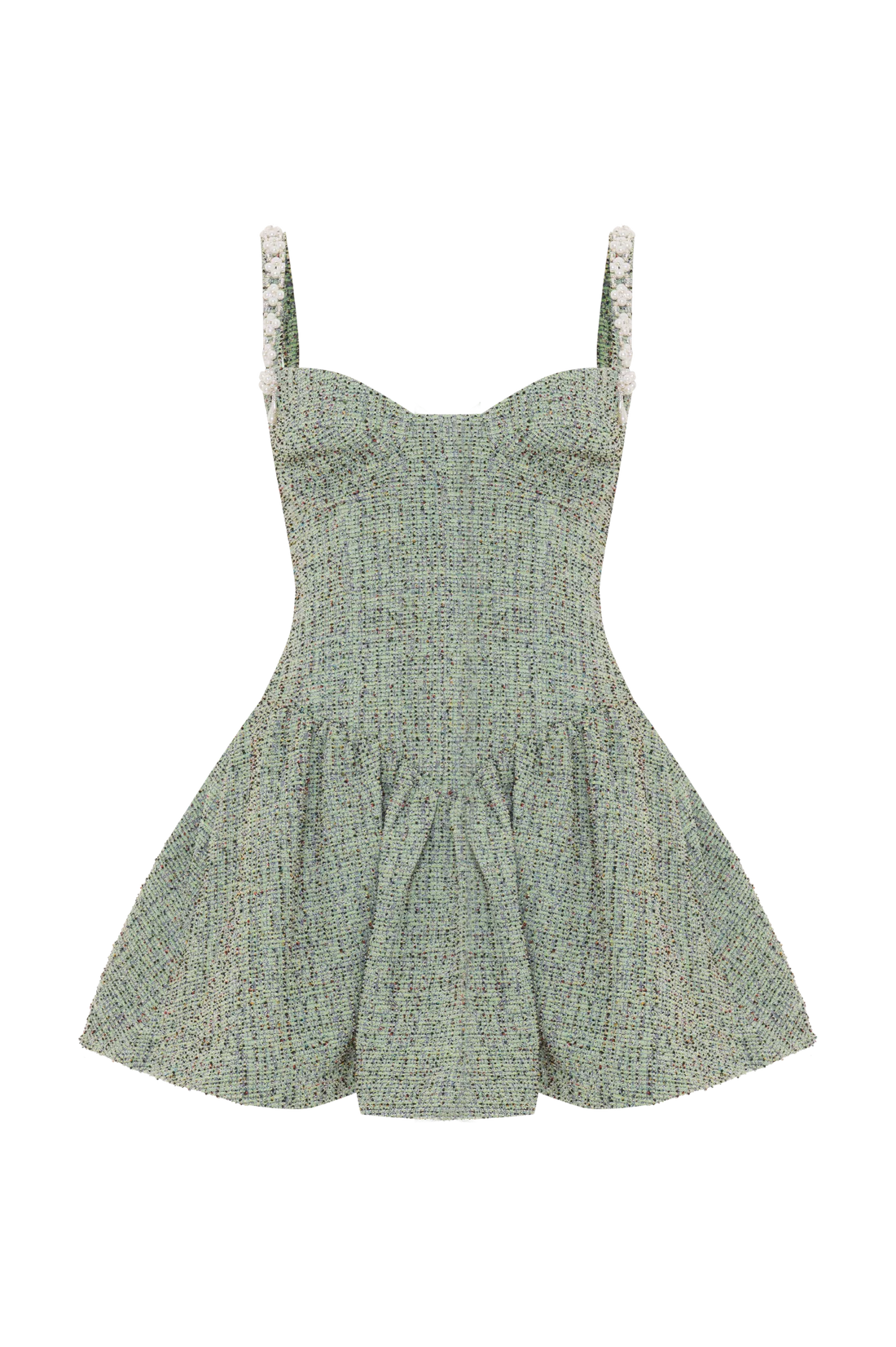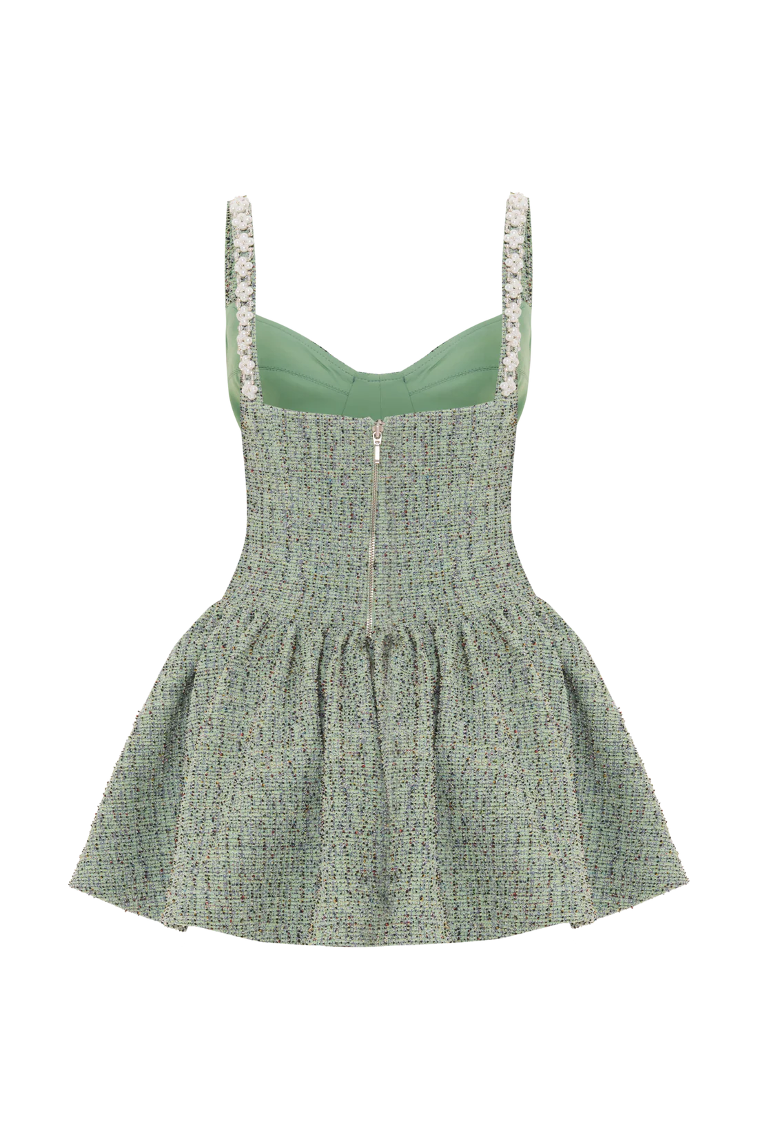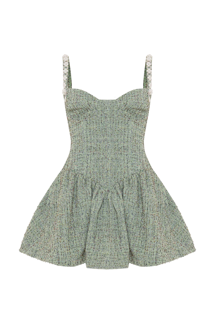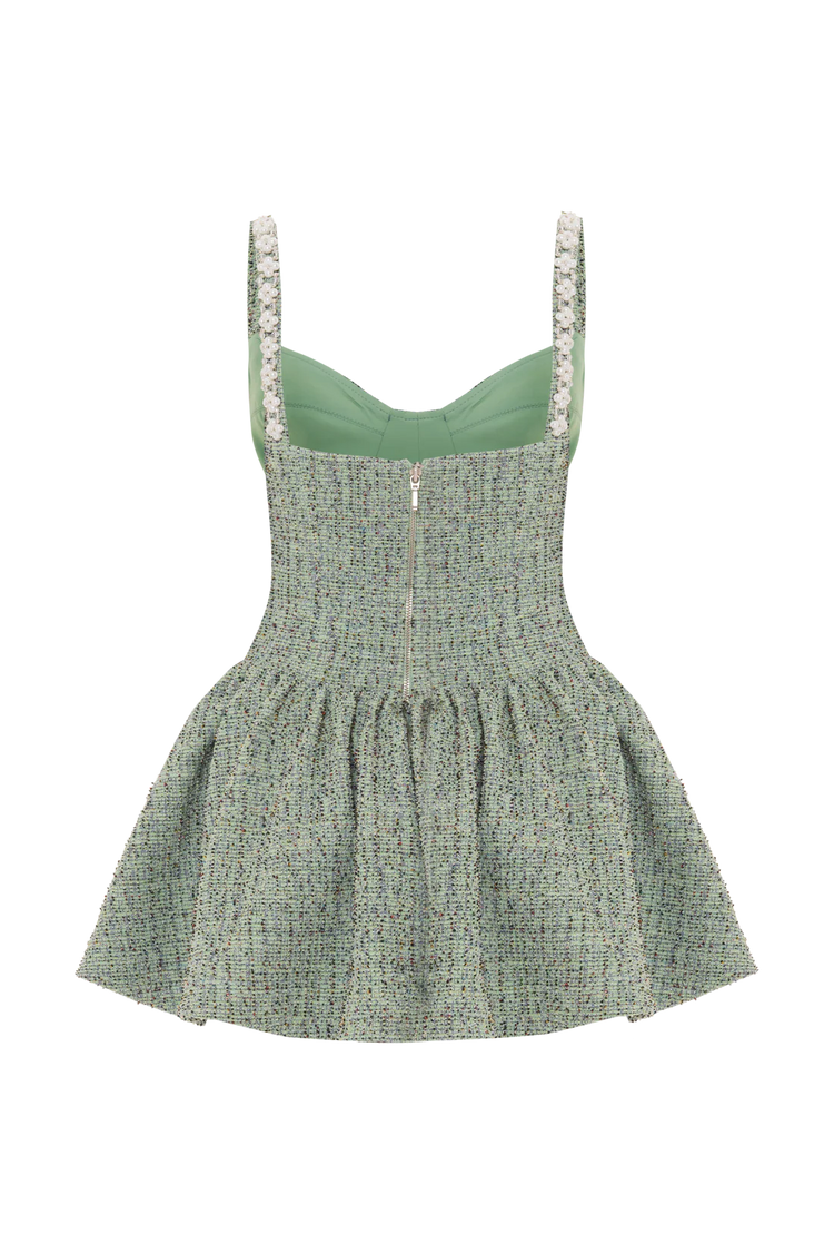 The Crystal Tweed Mini Dress blends tailored elegance with a romantic twist. Made from soft tweed knit, it features an underwire neckline, structured boned bodice with internal lining for a sculpted fit, and a low V-shaped waist that flows into a voluminous skirt with discreet side pockets. Pearl-embroidered straps with delicate pendants add a graceful, feminine finish. Back zip closure.