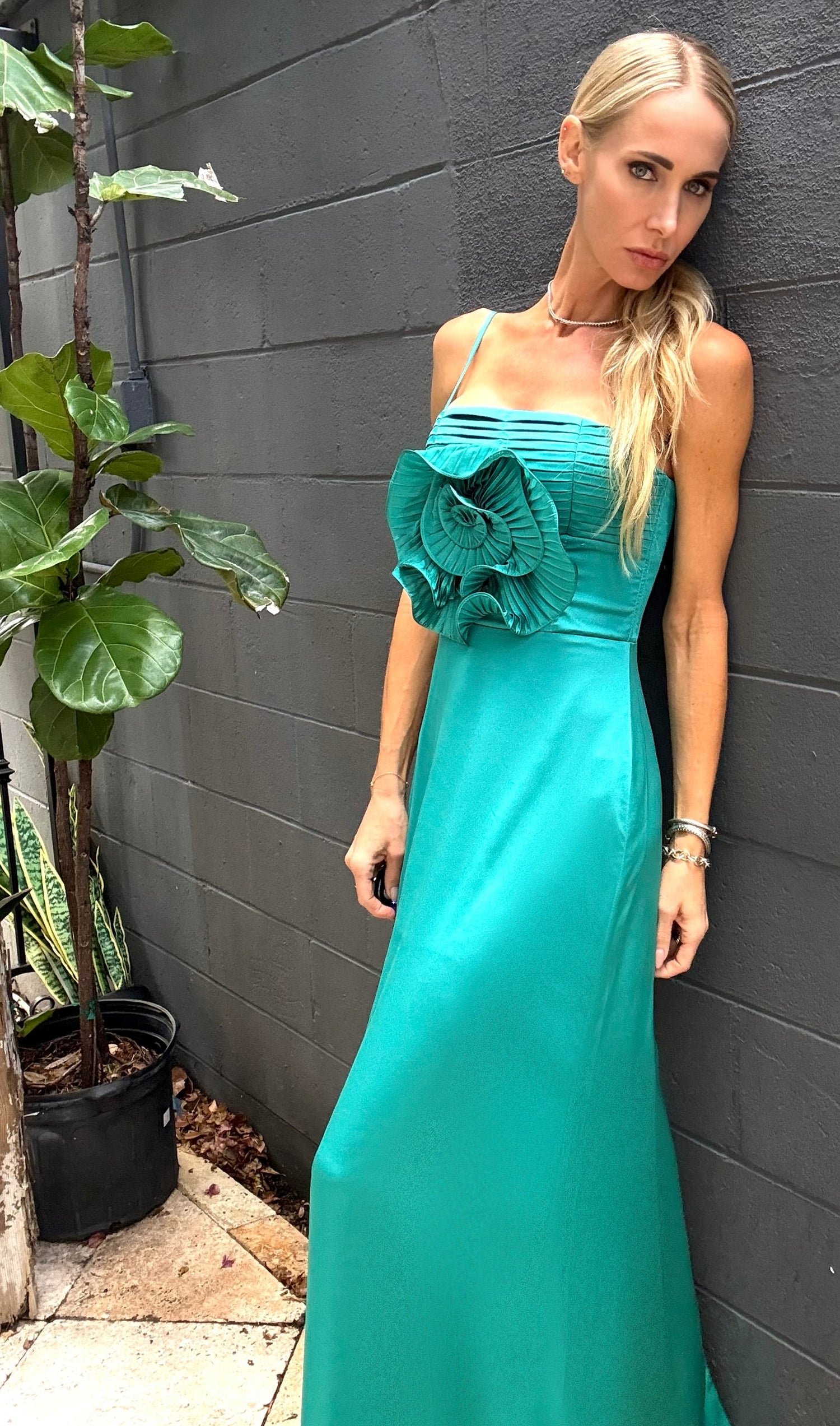 Crafted from fluid satin, this gown is elegance in motion. The silhouette is adorned with a hand-embroidered flower appliqué at the bodice, creating a sculptural focal point. Cut with a slim fit through the waist and hips, the design flows into a floor-skimming skirt that moves gracefully with every step. Finished with delicate straps and a concealed back zipper for a flawless finish.