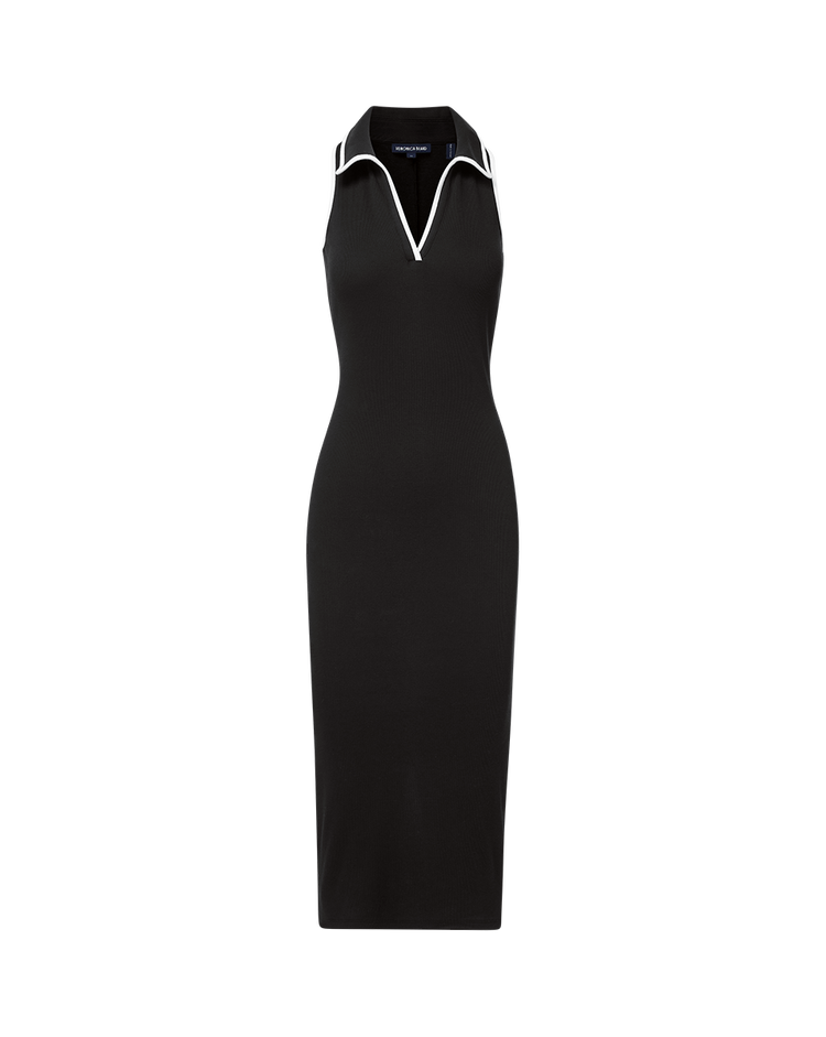 Effortlessly chic and sporty, this body-skimming polo dress is knitted from premium stretch cotton for a perfect fit. The sleeveless, midi silhouette, in black, features white contrast piping along the armholes, collar, and neckline. Pair this versatile go-to with sandals for a laid-back look or dress it up with heels for something more polished.