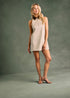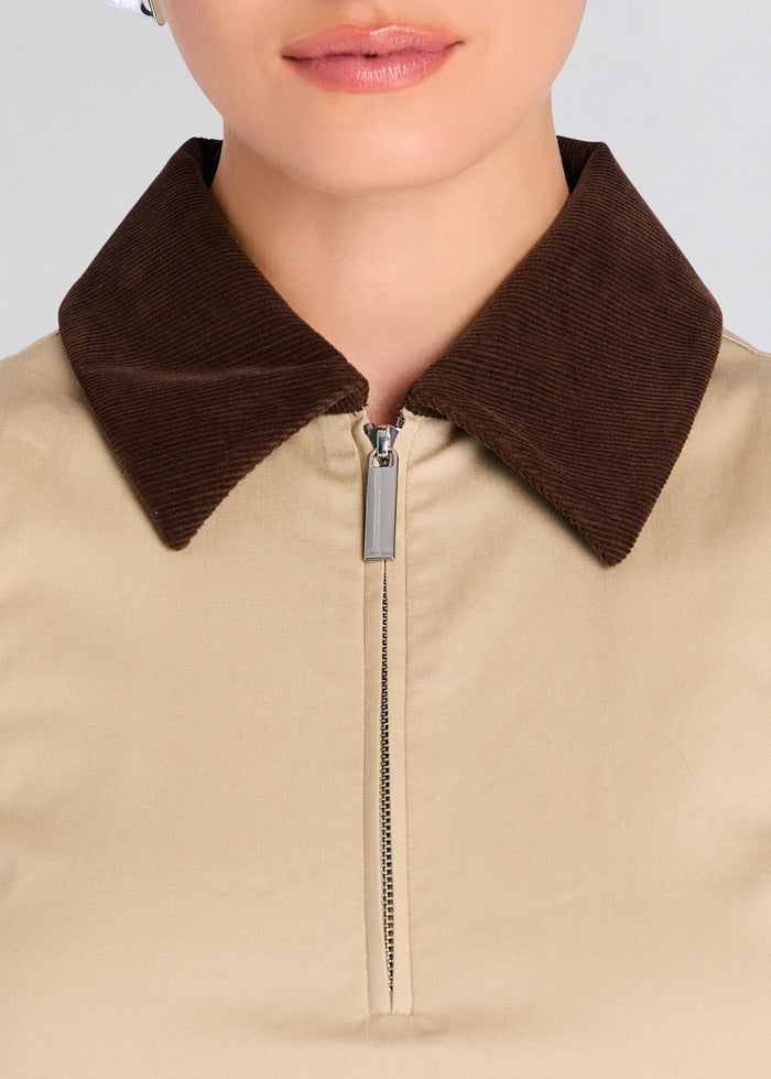 Sleeveless, barn-style mini dress with corduroy collar detail. Shown here in Sand.