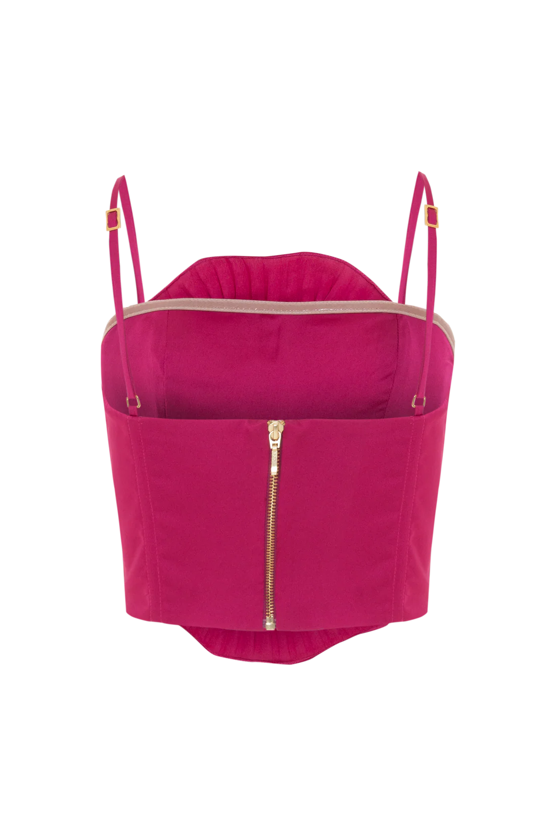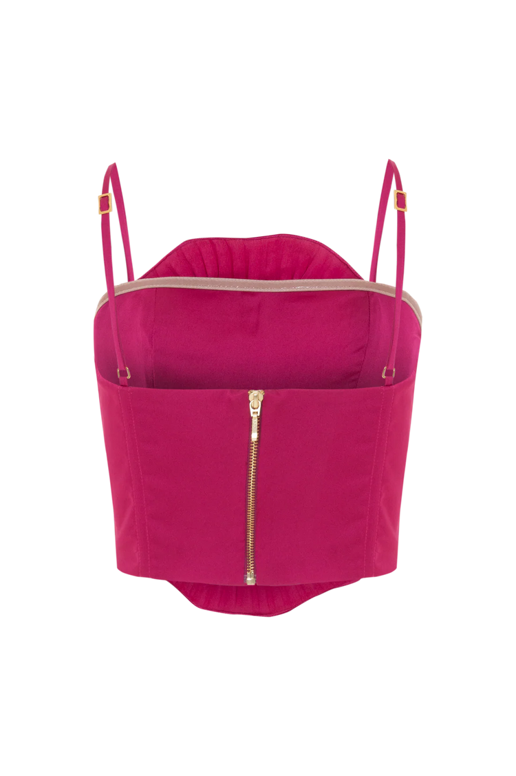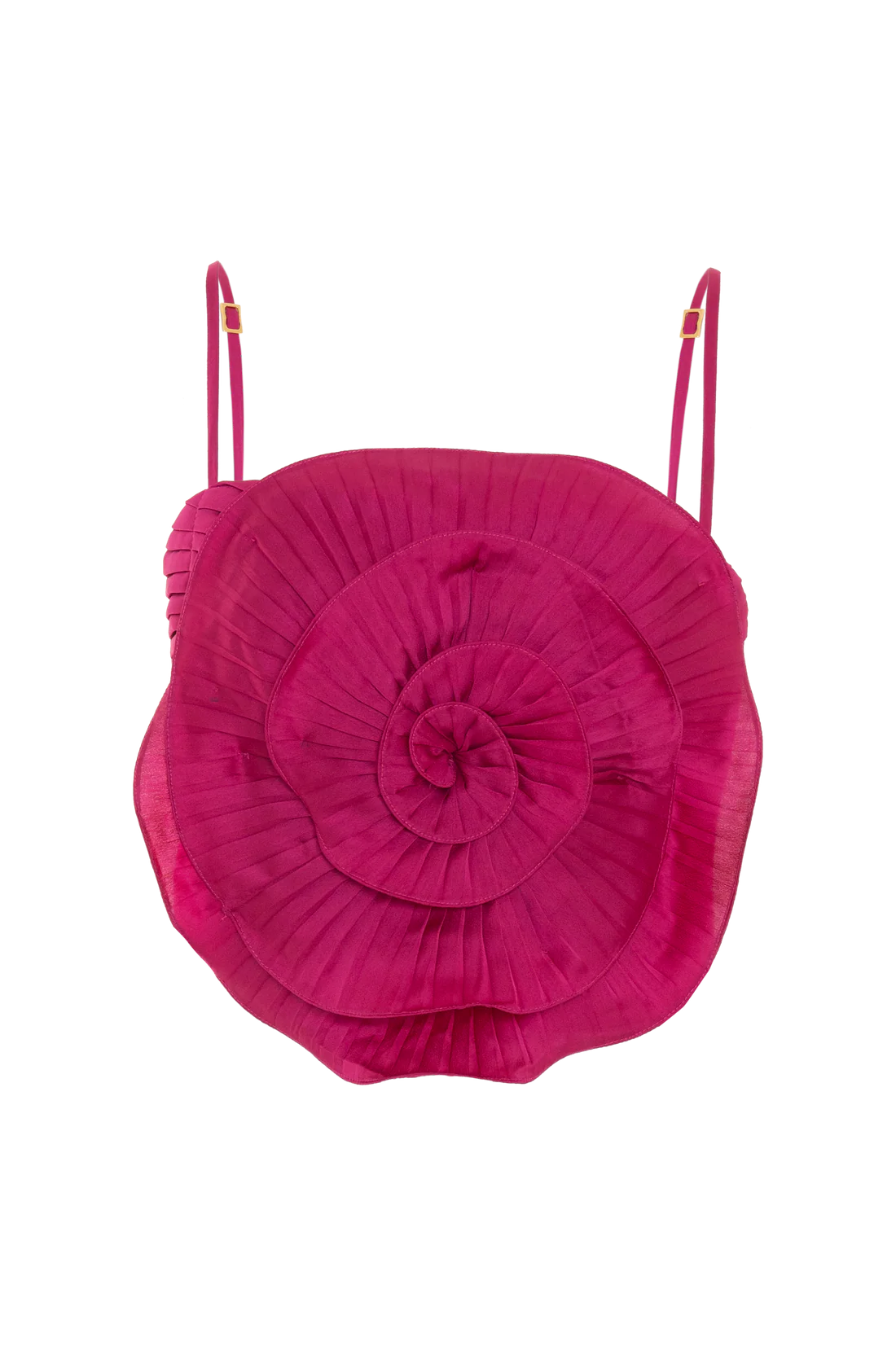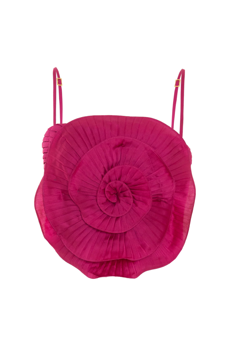 Satin top with full lining, adorned with an elegant pleated embroidered flower on the front, delicate bust pleats, adjustable thin straps, and a sleek metal zipper at the back.