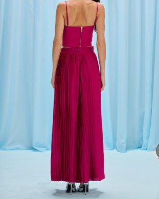 Flowy pleated satin pants fully lined for comfort, featuring a stylish belt with buckle and a discreet invisible zipper closure at the back.