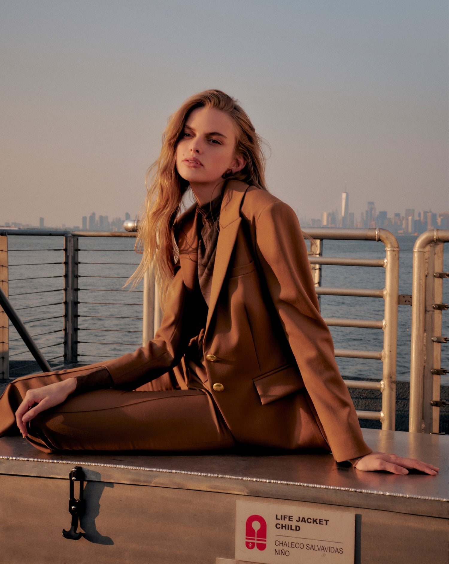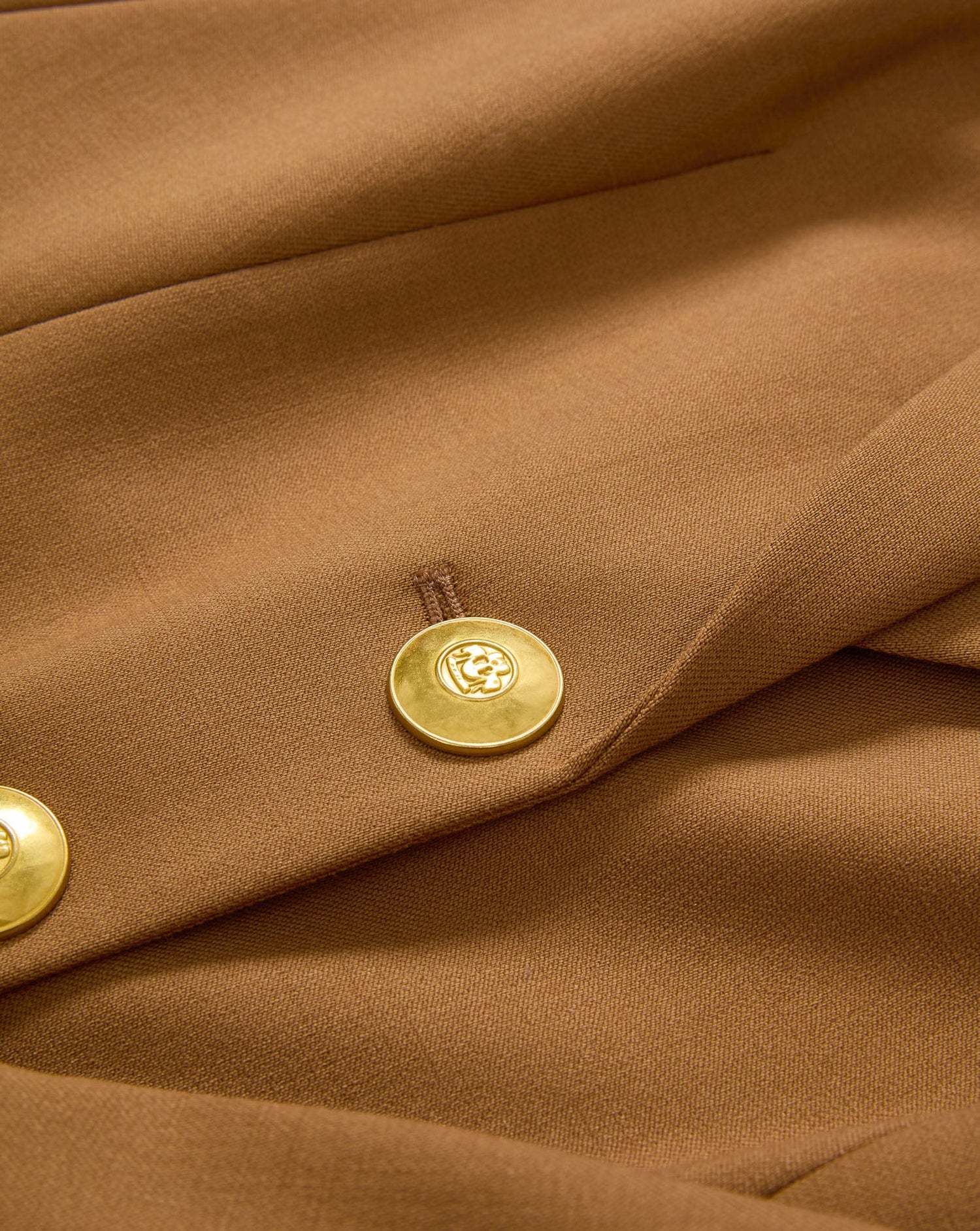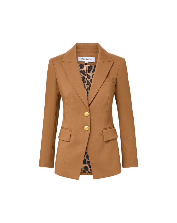 Tailored to perfection. Expertly crafted from a premium Italian stretch wool-blend, the Izara blazer features a slim, single-breasted silhouette with front darts to define the waist. A peak lapel, front flap pockets, and our signature crest buttons add a refined touch, while leopard-print lining makes a surprise statement. Pair this fitted tan blazer with trousers for a polished look, or with denim to elevate the everyday. Then add your favorite dickey.