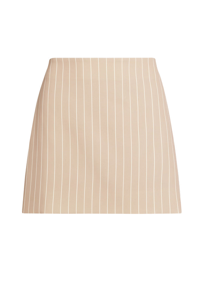 Mid rise pinstripe mini skirt. Pair with the Angelina Vest Top to complete the look. Shown here in Oak/Eggshell.