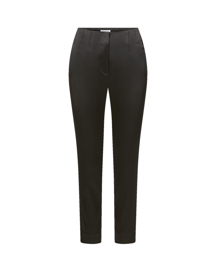A sleek dress pant with versatility. Expertly tailored in the USA from premium Italian satin, the Stila's high-rise Hollywood waistband defines, while its slim, straight leg elongates—cropped at the hem to show off your shoes. Welt pockets and a concealed hook-and-bar closure create a clean, streamlined finish. Pair this black trouser with an oversized shirt or sweater to elevate the everyday—or with the coordinating Cynthia satin jacket for a chic tailored set.