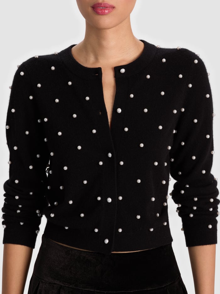 Alice + Olivia's best-selling Dollie is back this season with some added fun. Spun from ultra-luxe 98% cashmere and cut in a cropped, shrunken fit, this embellished cardigan is as perfect thrown over the shoulders as it is buttoned up for an effortlessly polished look. A true cult favorite, it’s the kind of piece you’ll want in every color- and then some.