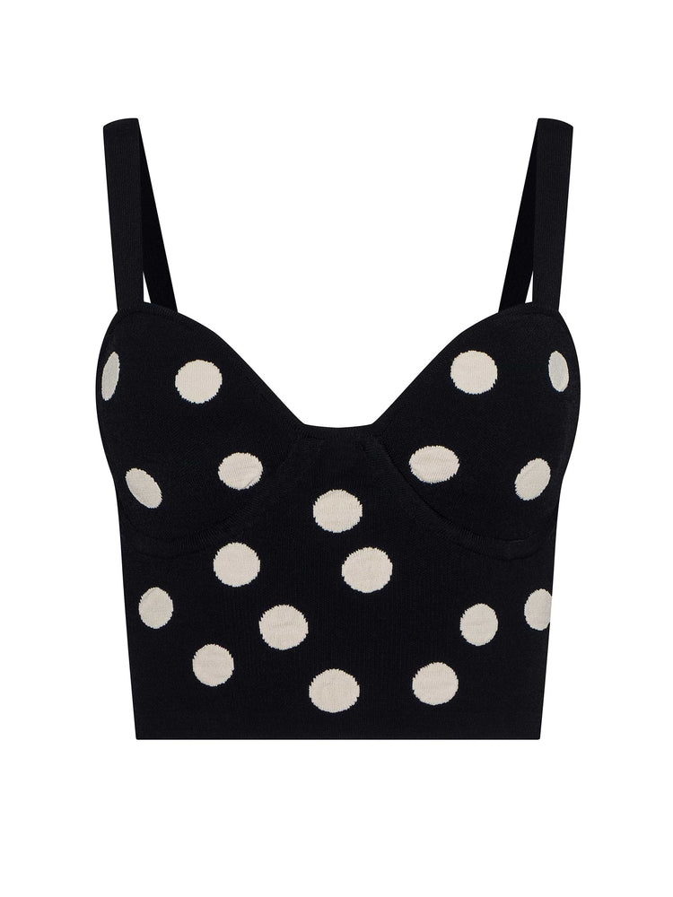 This style debuted in L'AGENCE's Spring 2026 NYFW presentation, After Hours. The Tula top features a corset style silhouette constructed from a compression knit with jacquard polka dots. Style it with the matching Mae skirt or wear it with your favorite jeans.