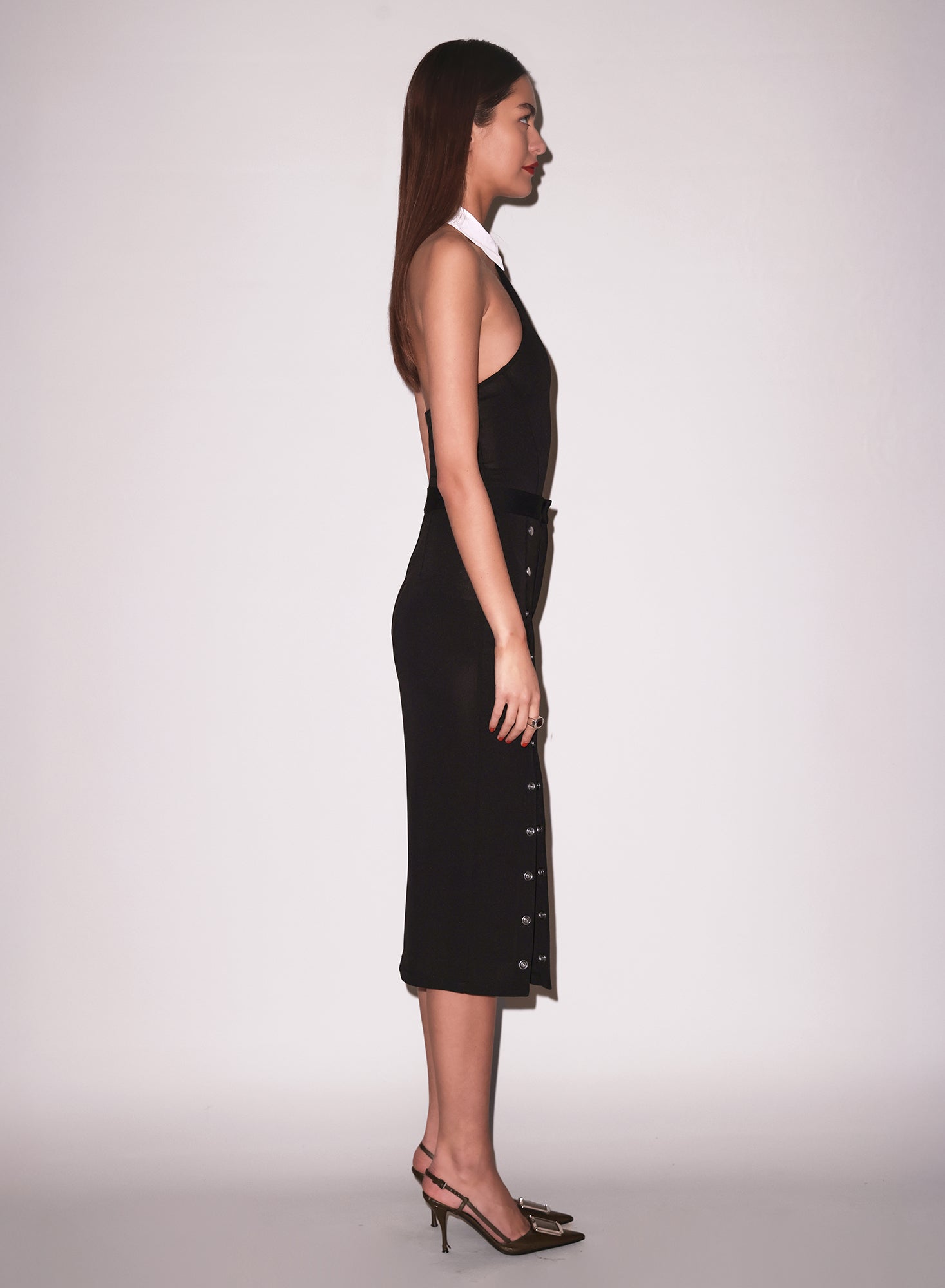 Hot under the collar. Fleur Du Mal's Hannah Bodysuit, cut from matte jersey with poplin collar and necktie detail. Hook and eye closure at collar, with bottom snaps and thong cut. Looks chic with Undo Me Skirt.