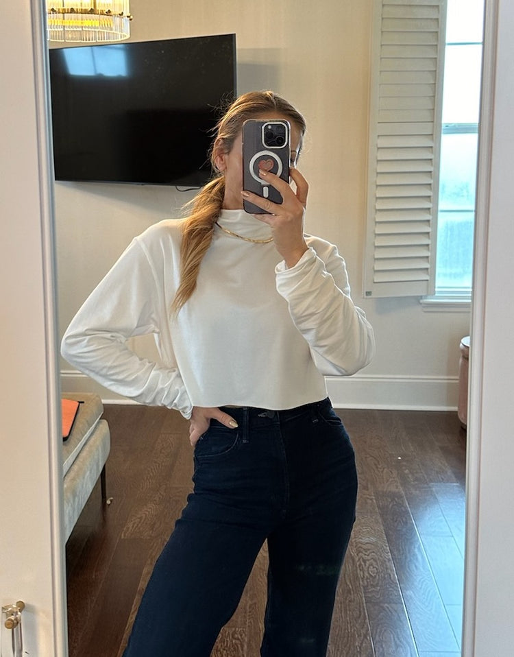 Stillwater's best selling long sleeve tee in the softest Tencel cotton with a touch of spandex, updated this season with a mock neck. This crop tee has a relaxed fit & raw hem.