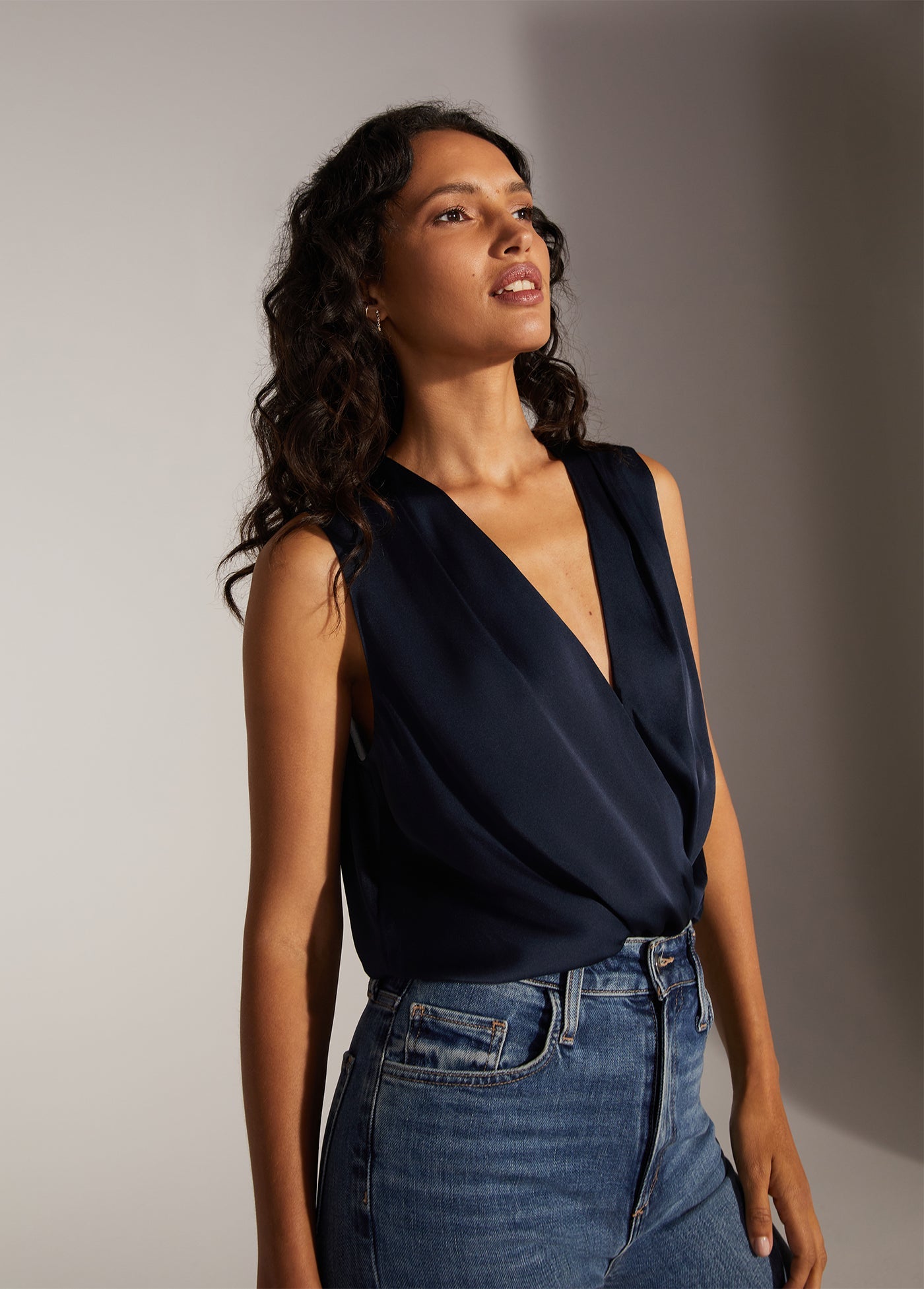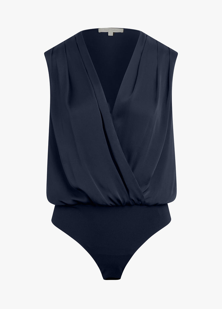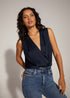Text me when you get home. Favorite Daughter's best-selling, satin bodysuit with a pleated neckline and button cuffs, now in a sleeveless version. The soft drape of the top is a no-fuss tuck thanks to the comfortable snap bodysuit so it's effortlessly easy to wear on its own and a favorite look when styled under a blazer.