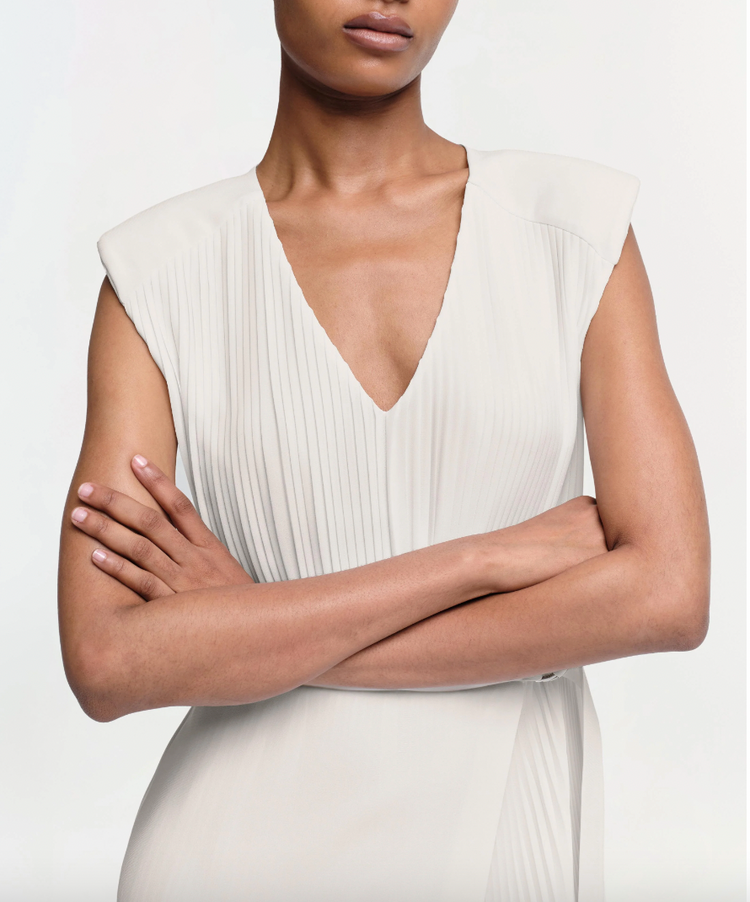 The Margo Dress in Ivory. This sleeveless mini features a plunging V-neckline that adds a touch of allure, complemented by the elegant drape of pleated fabric which creates a refined texture. The asymmetric wrap design is secured with a side tie, enhancing the waistline.