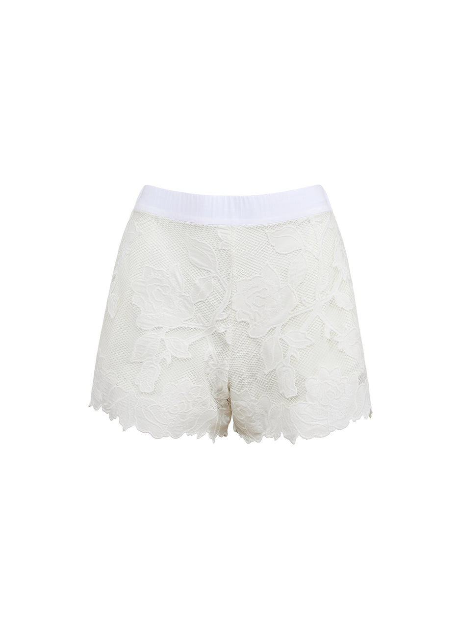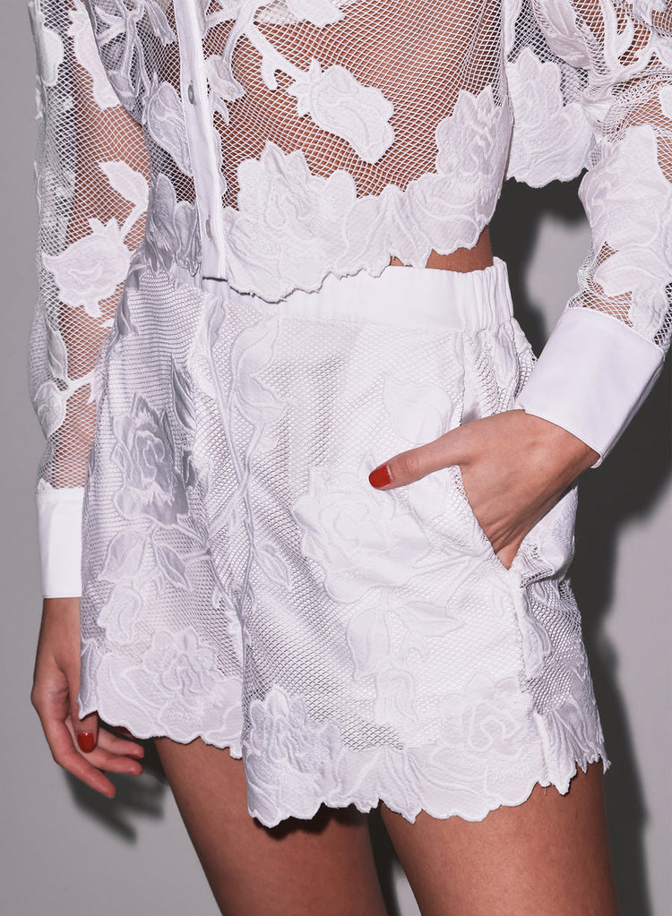Fleur Du Mal's Collette Short, with custom floral embroidery and satin lining. Features front pockets, elastic waistband, and scalloped edges. Complete the set with the matching Collette Cropped Shirt.