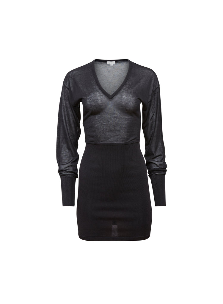 Fleur Du Mal's Kate Mini Dress, featuring flattering v-neckline with semi-sheer knit top & long sleeves. Bottom skirt is solid knit, mini length. Looks chic layered over the Lily Embroidery Balconette Bra & Cheeky.