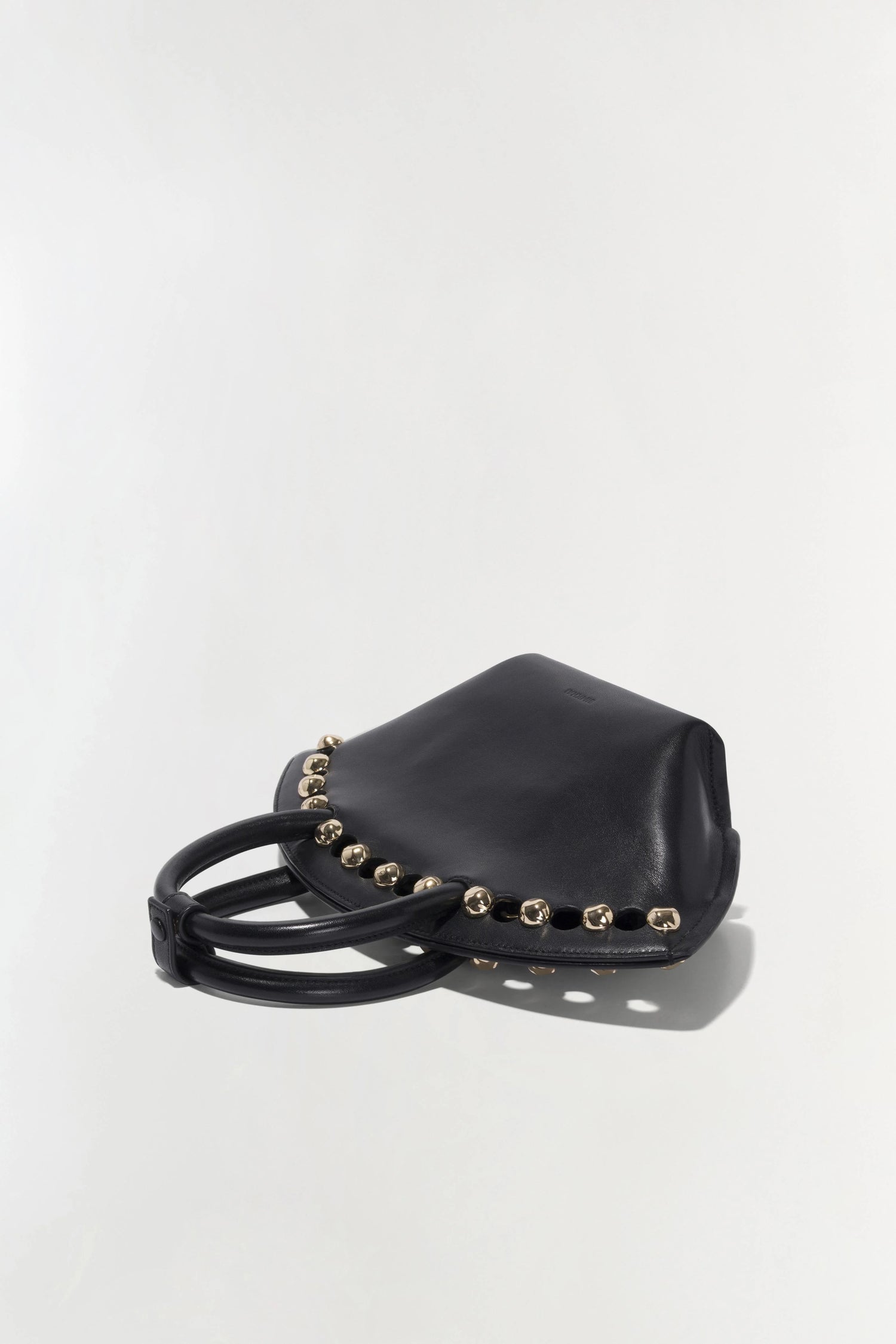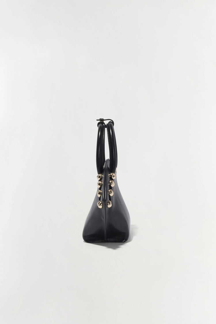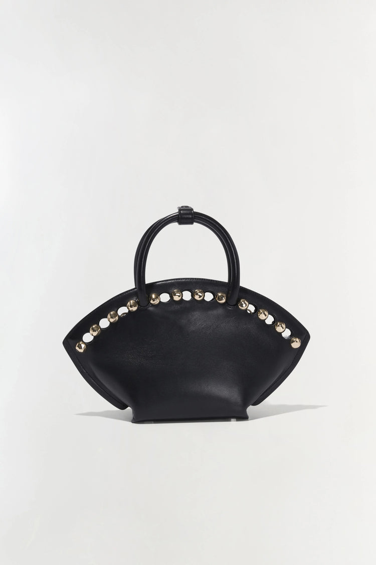 The Amaya Small Studded Tote in BlacK. A clamshell-shaped tote with a top handle and studded trim.