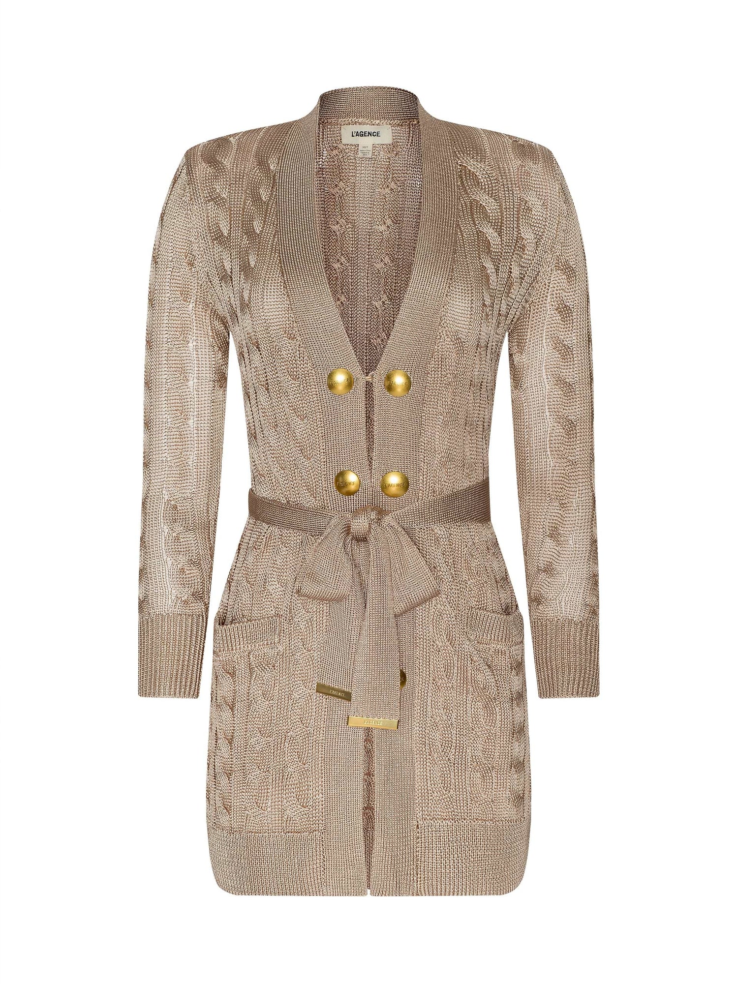 Meet Penelope, the cardigan that pulls everything together, crafted from a luxe cable knit with a silky handfeel and finished with logo buttons for added glamour. Think polished enough for dinner, relaxed enough for daytime, with a neutral camel tone that goes with everything.