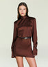High neck mini dress with long sleeves, button cuffs, and an extended tie detail at back. Shown here in Burnt Toffee.