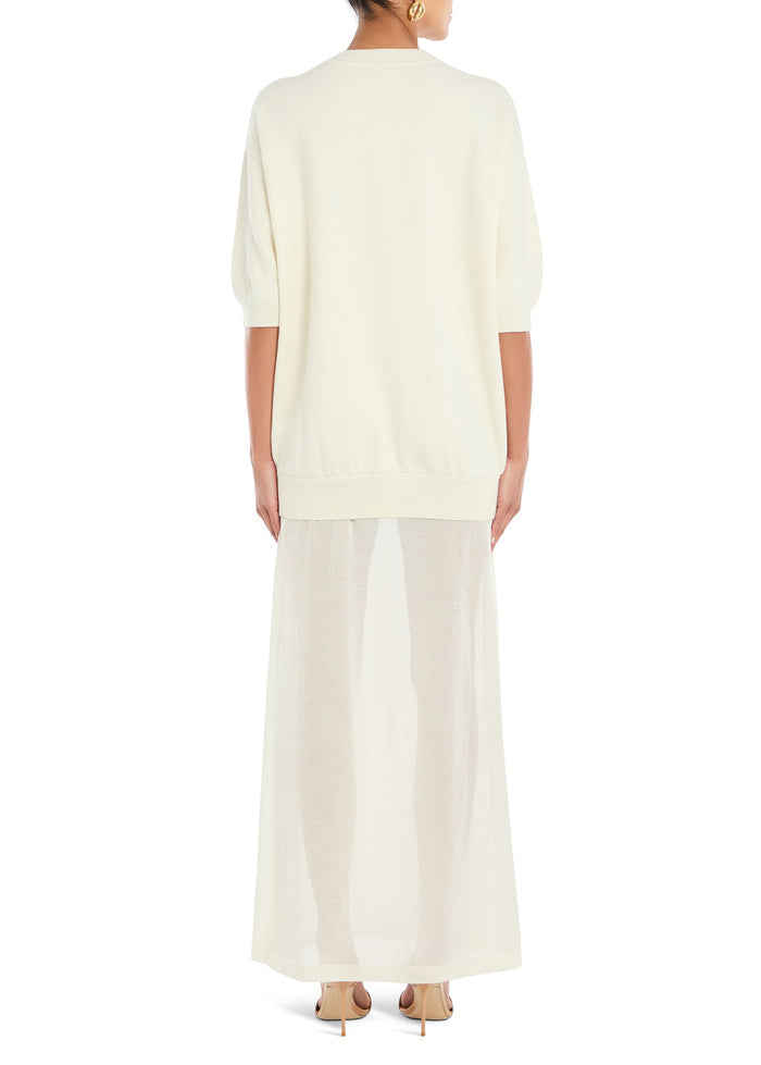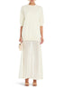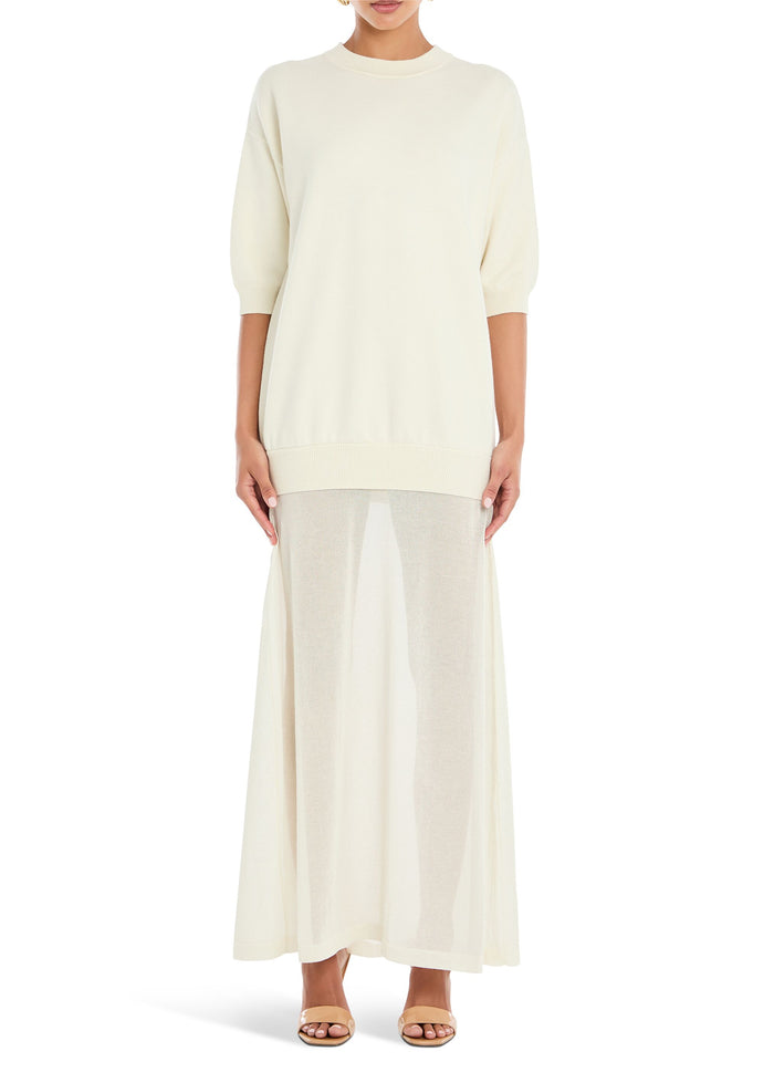 Short sleeve knit maxi dress with sheer skirt detail. Shown here in Eggshell.