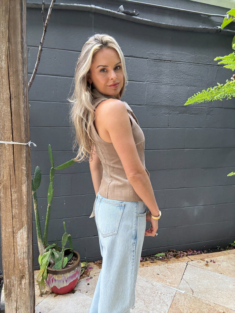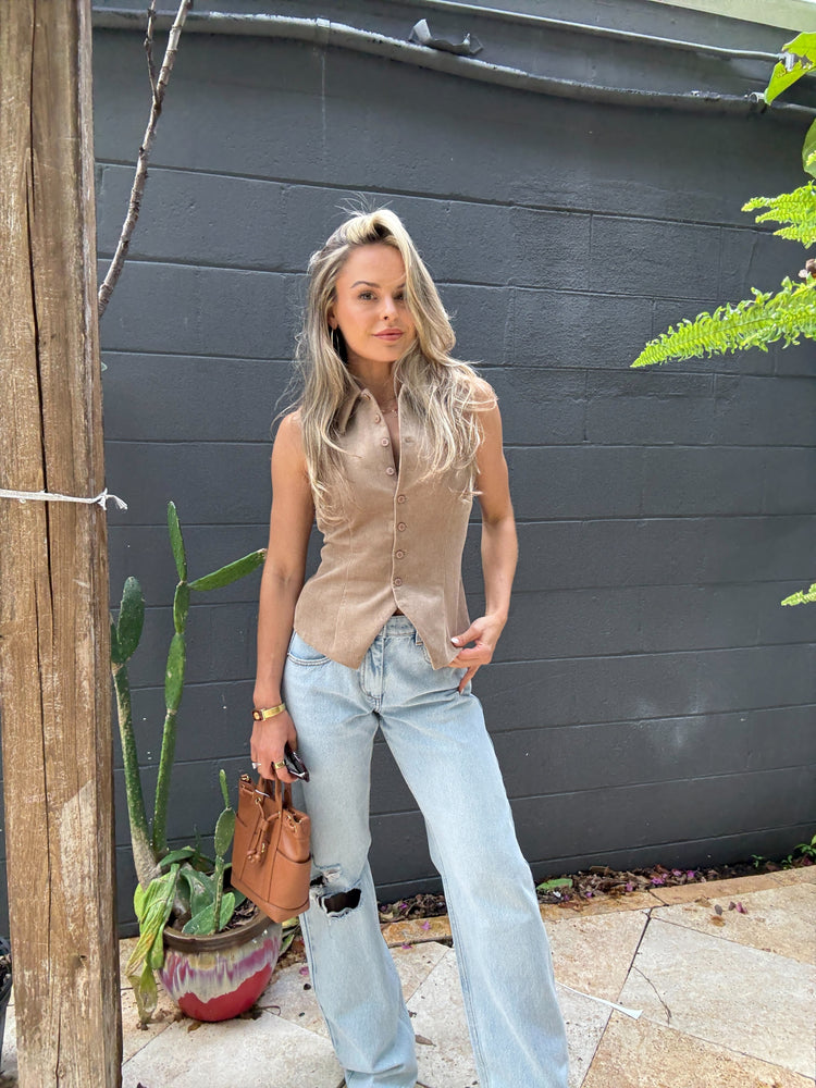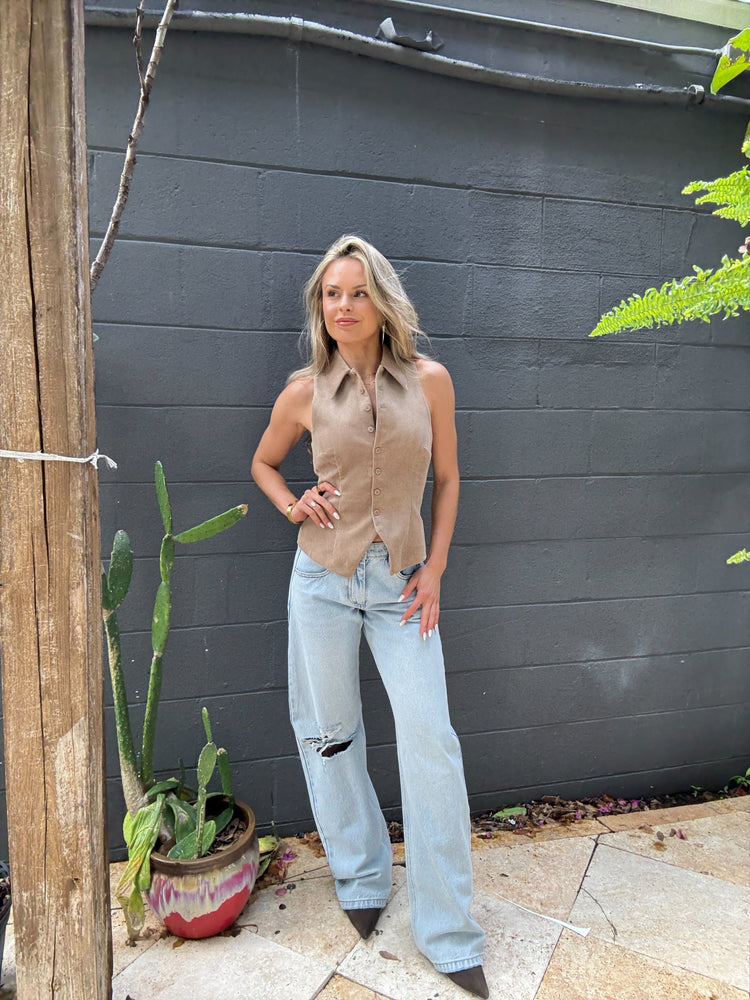 Sleeveless, corduroy vest with button up neckline and collar. Shown here Desert.