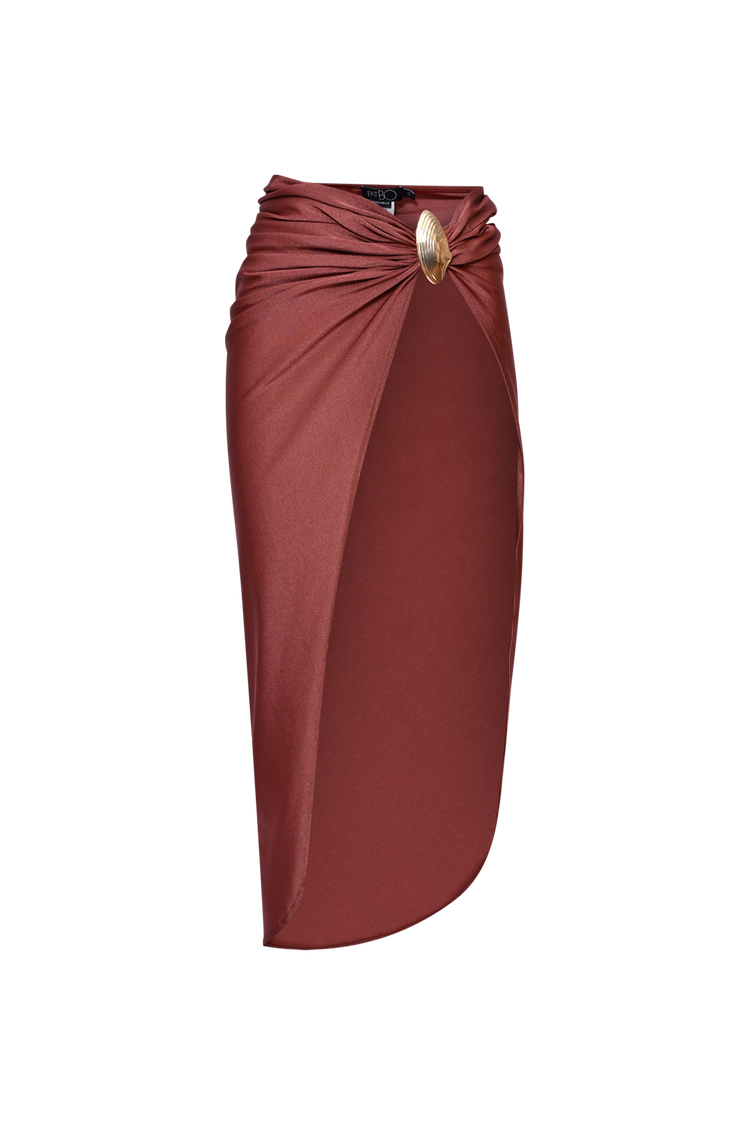 The Golden Dune Lycra Beach Skirt is a bold choice in beachwear, featuring a deep slit and a gold shell buckle at the waist.