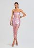 The Carmin Embellished Dress delivers unique glamour for standout occasions. Designed with delicate thin straps and a sleek tea-length bodycon silhouette. Sheer fabric is adorned with square paillettes, adding texture and dimension for a striking finish. Ideal for Ibiza escapes, music festivals, and vacation evenings. Shown here in Lavende.