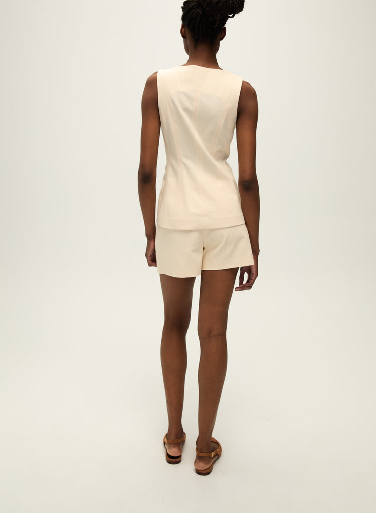 The essential tailored vest. Crafted from a soft and breathable stretch-cotton blend, Avalina is designed with flattering seams to accentuate the waistline and features a deep V-neckline, an angled split hem, and our signature crest buttons. Pair this ecru vest top with the coordinating Devina Short for a sleek summer set.