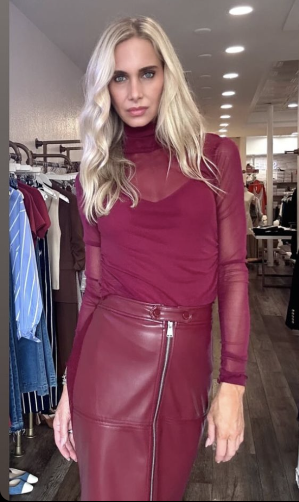 - Mesh fabric with turtleneck styling and ruched lettuce trim