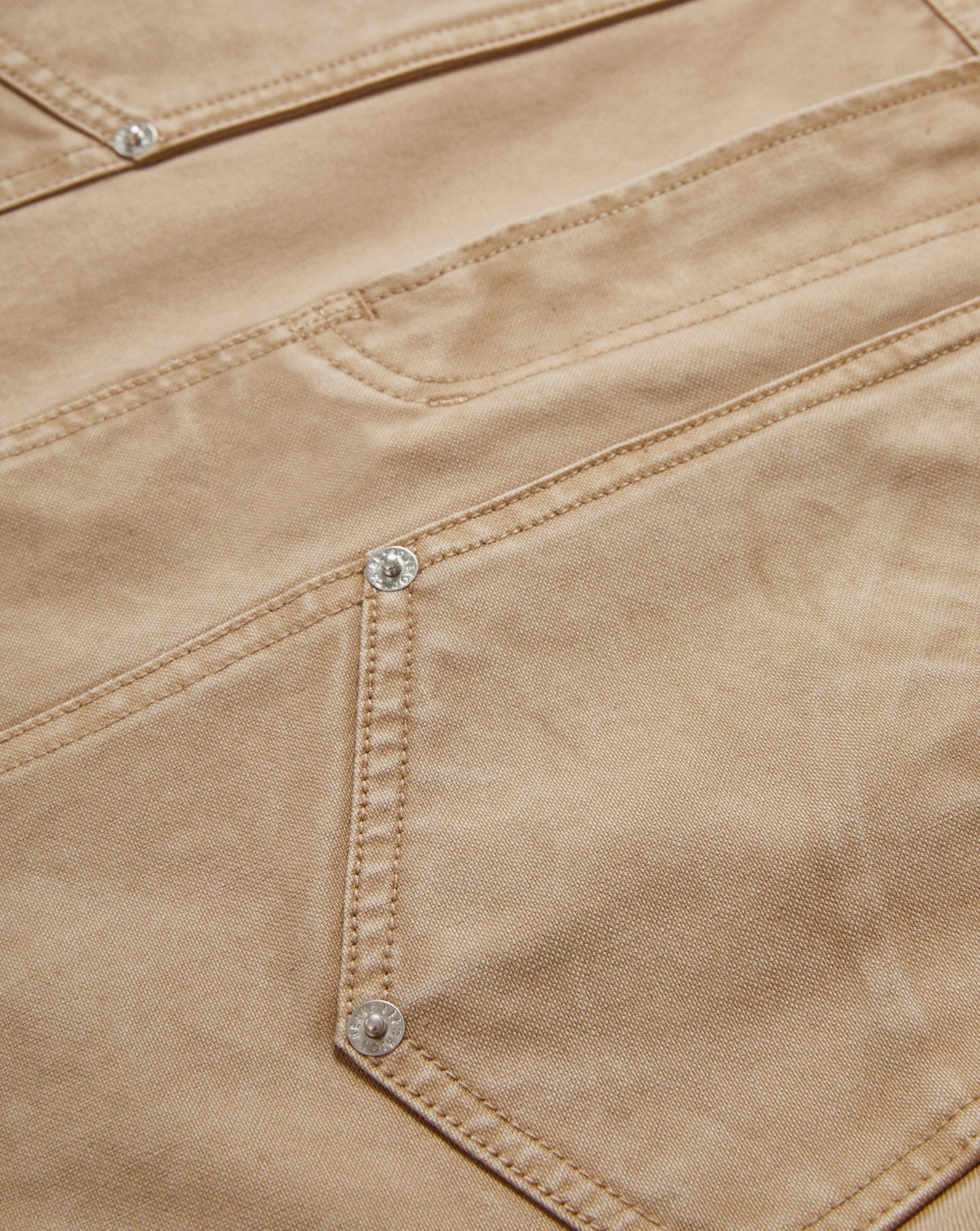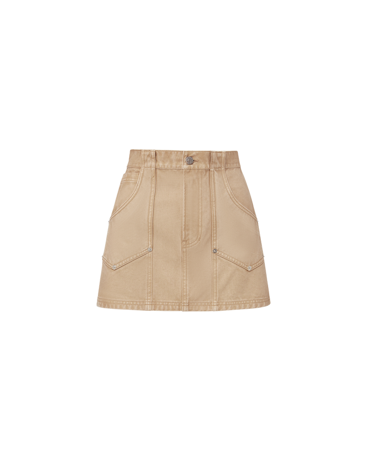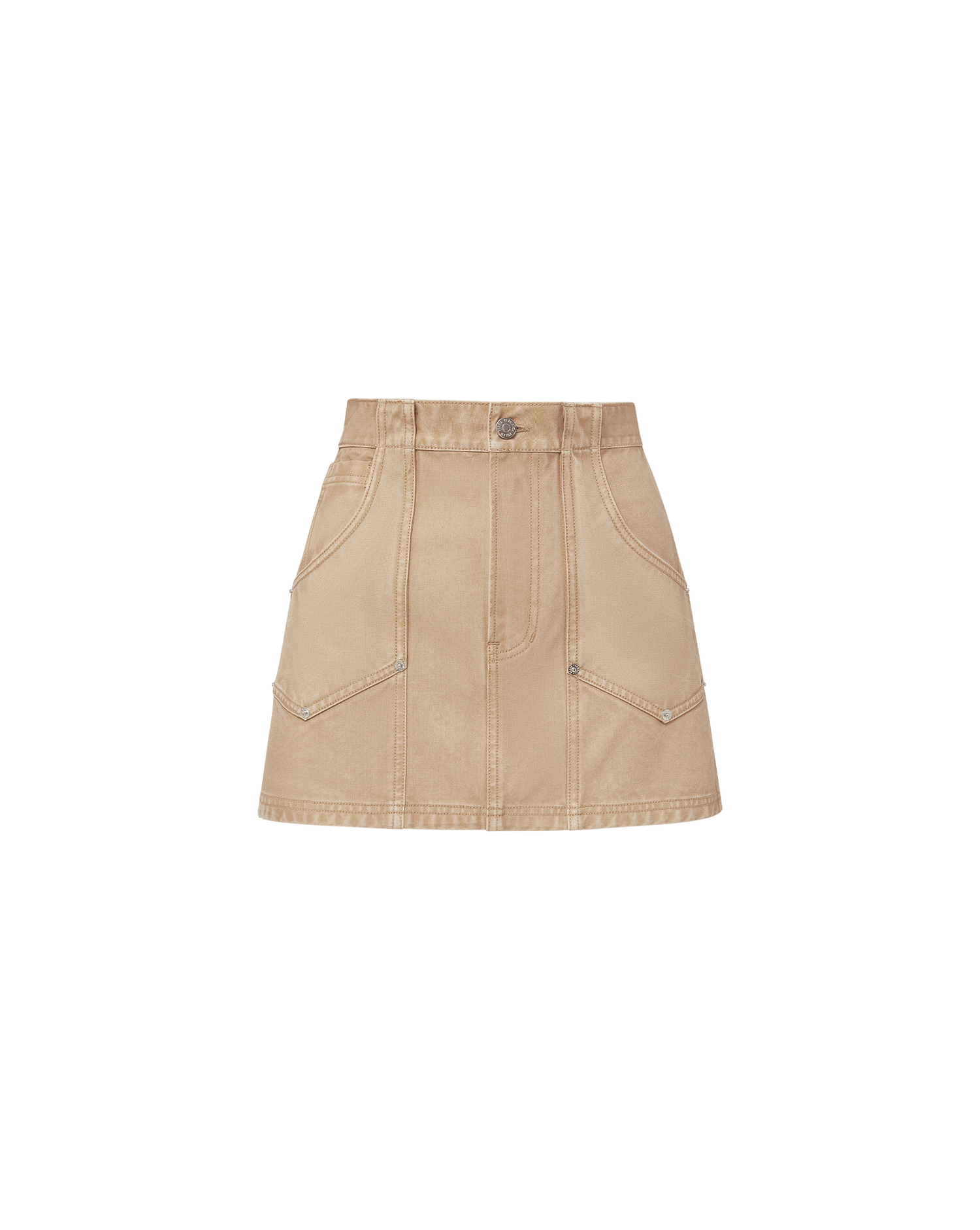 The ease of denim in a chic little mini. Made from premium non-stretch cotton in a faded khaki wash, the Stelene mini skirt features an A-line silhouette and a classic five-pocket design. Endlessly versatile, it's the essential warm-weather uniform. Just pair with a ribbed tank and strappy sandals or sneakers—pure off-duty chic.