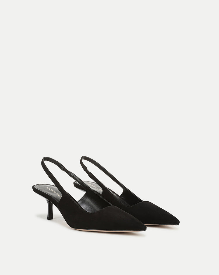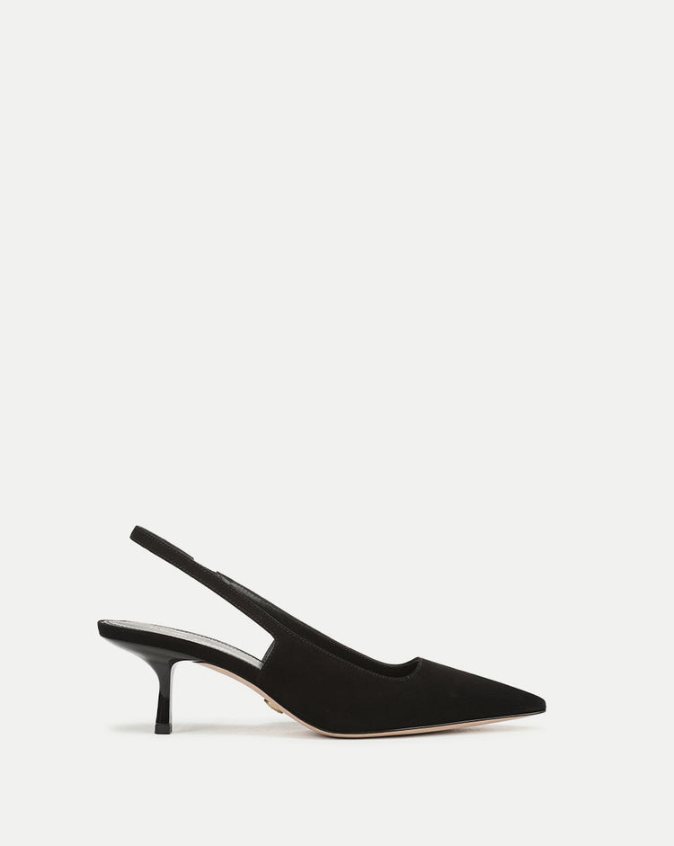 A classic that never goes out of style, the Cashel is the definition of sleek versatility. Crafted in buttery dark brown suede, it features a chic kitten heel, pointed toe, and elasticated slingback strap—finished with a cushioned leather footbed for all-day comfort. This slingback heel is a hero piece that pairs seamlessly with anything in your closet.
