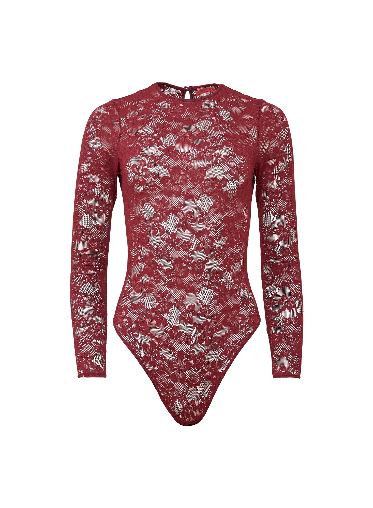 Fleur Du Mal's Le Stretch Lace Long Sleeve Bodysuit, cut from ultra comfortable 4-way stretch lace for a smooth, seamless finish. Thong cut with long sleeves and back keyhole detail. Take it out layered over the matching Le Stretch Lace Demi Bra and Thong.