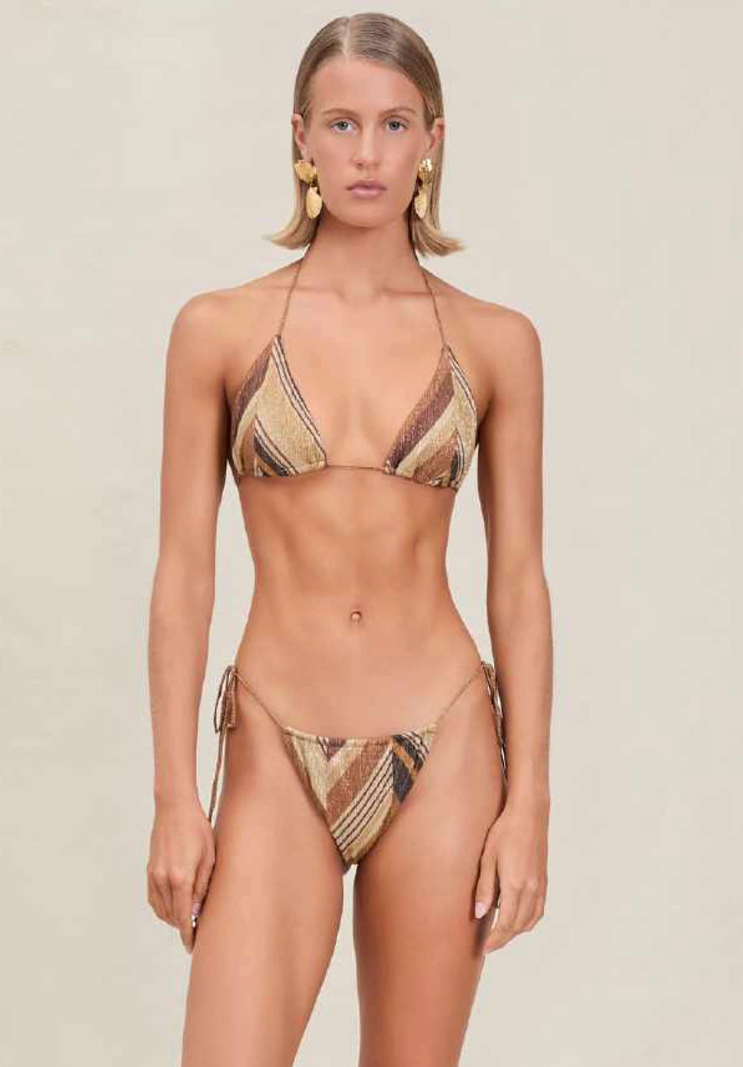 The Winona is an adjustable triangle top with glass bead detail at straps. Pairs back with the Whit Bottom.