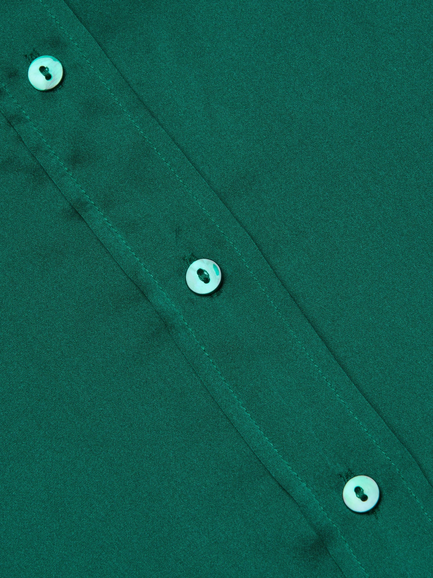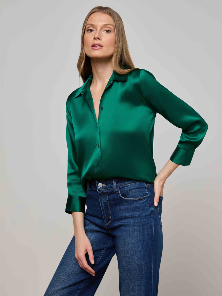 Meet the iconic silk button-down that belongs in every wardrobe. L'AGENCE's signature three-quarter sleeve shirt is back in a rich dark green.