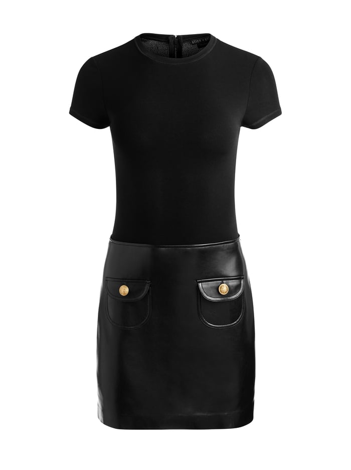 Like a perfect outfit pre-styled, Alice + Olivia's Sydney gives the illusion of a top and skirt. Its bodice is body-skimming while the vegan leather skirt has a sleek, A-line silhouette with front pockets. A back zip closure finishes the look. Pair with knee-high boots and hoops for a chic weekend outfit.
