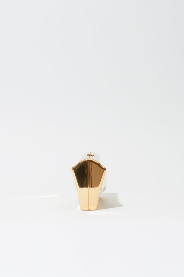 Crafted from sleek metal, this clutch is defined by its clean lines and angular contours. The geometric silhouette and detachable strap lend both edge and elegance. Designed to stand out through simplicity and structure.