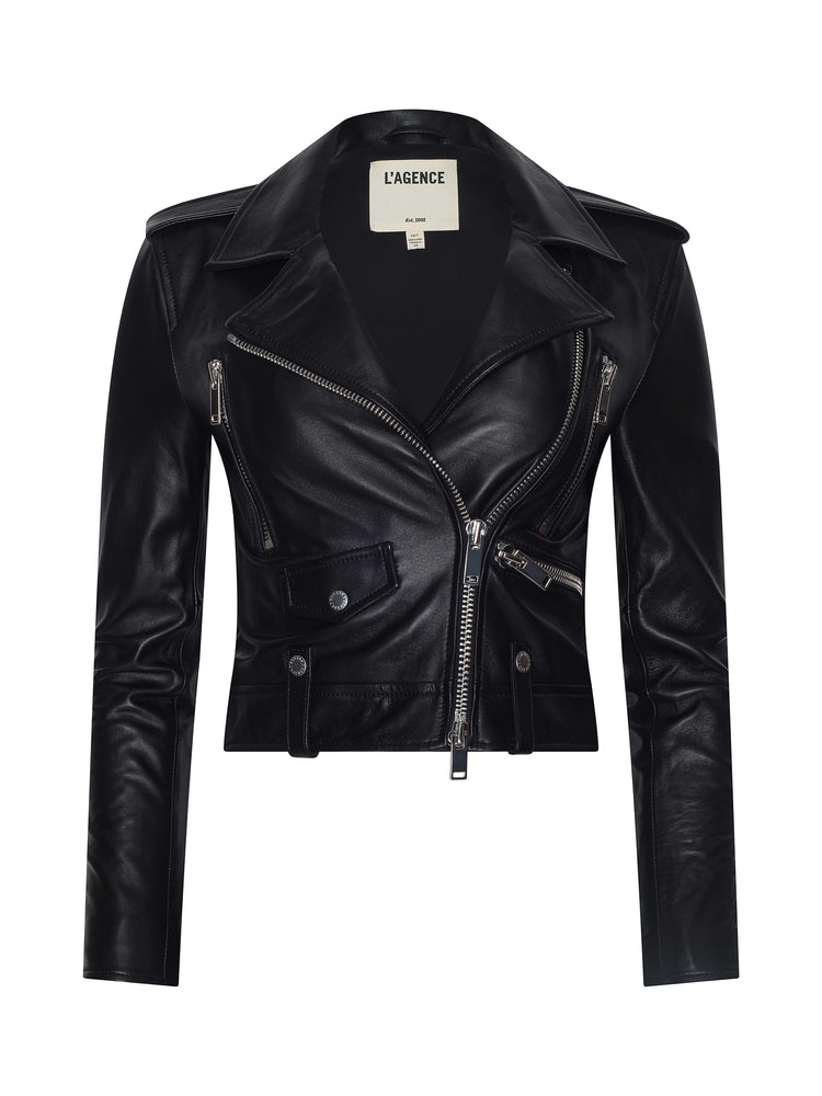 A feminine take on the moto-style leather jacket,  crafted in 100% premium lambskin leather. The Biker features metal snaps at the lapel, zipper details at the sleeves, slimming panel construction along the back, and an off-center two-way zipper closure. Fully lined.