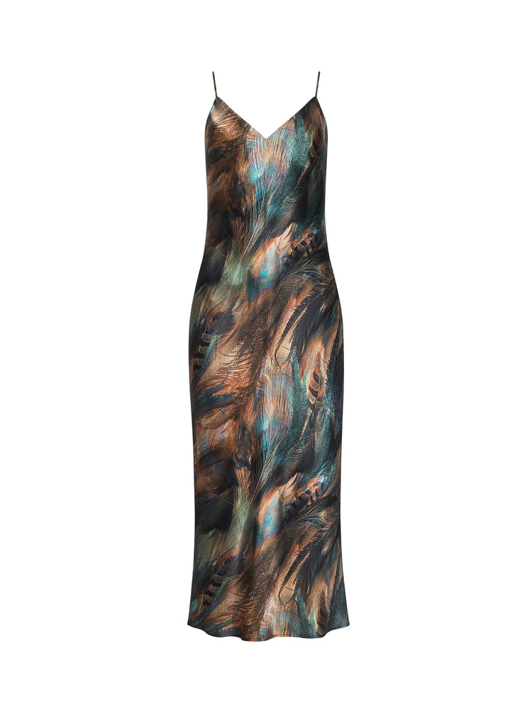 L'AGENCE's iconic silk slip dress is back in a dynamic teal feather print. Designed with a deep V-neck and subtly sexy bias cut, this midi dress is a year-round essential. Pair with a strappy sandal for the perfect special occasion look.