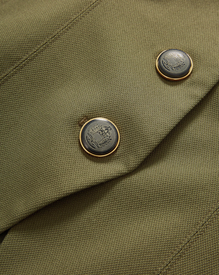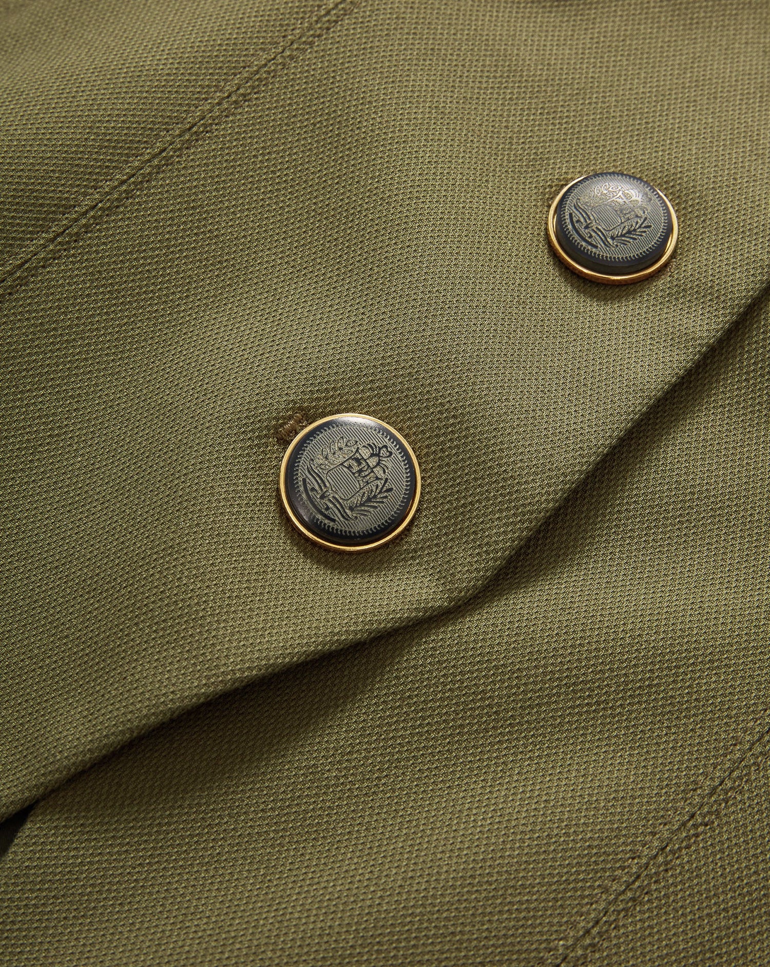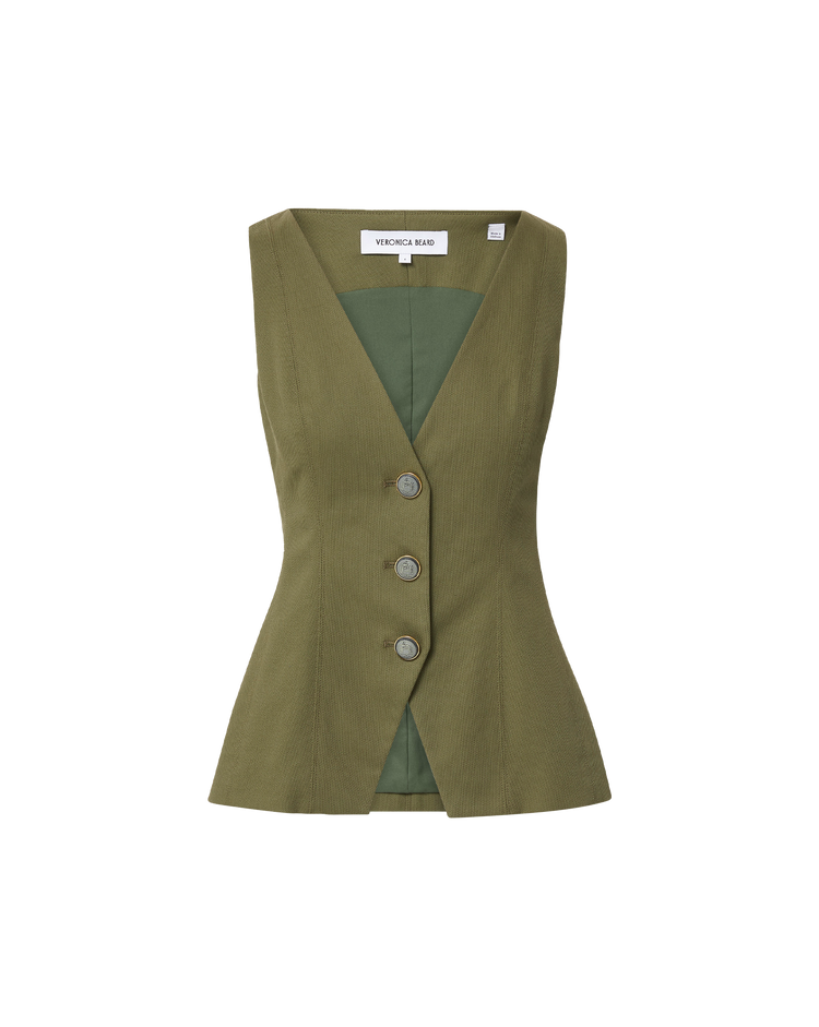 The essential tailored vest. Crafted from a soft and breathable stretch-cotton blend, Avalina is designed with flattering seams to accentuate the waistline and features a deep V-neckline, an angled split hem, and our signature crest buttons. Pair this army green vest top with the coordinating Arte pant for a sleek summer set.