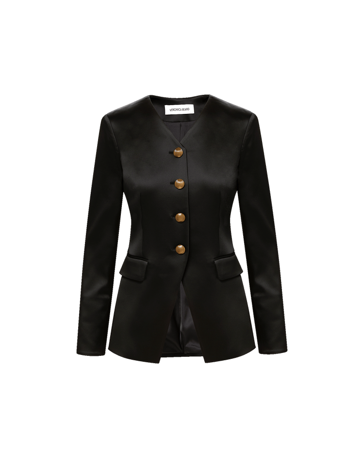 Sleek and sophisticated. Expertly tailored in the USA from premium Italian satin, the Cynthia is a black, single-breasted blazer featuring a darted bodice and angled hem for a waist-defining fit. A collarless V-neckline, gold statement buttons, and front flap pockets add a polished finish. Style this jacket with a slim pant and heels for the perfect desk-to-dinner look.