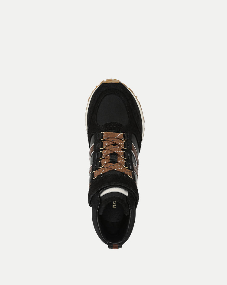 The Valentina you know and love—now with a nod to the classic hiking boot. Crafted in premium black suede, this sporty high-top features a padded ankle collar with a Velcro closure, gold-tone lace hooks with paracord laces, and a durable lug sole. The signature details remain the same: flattering lines, all-day comfort, and an interlocking-V leather detail—a subtle nod to the Veronica Beard logo. Perfect for days on the move, it’s ready to slip on and go.