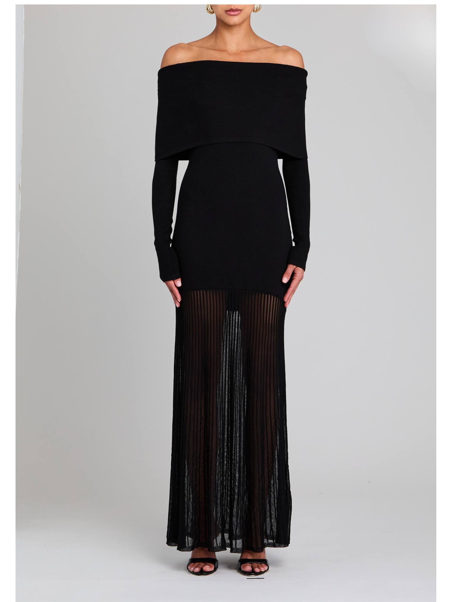 Off-the-shoulder, knit long sleeve maxi dress with sheer skirt. Shown here in Black. More images coming soon.