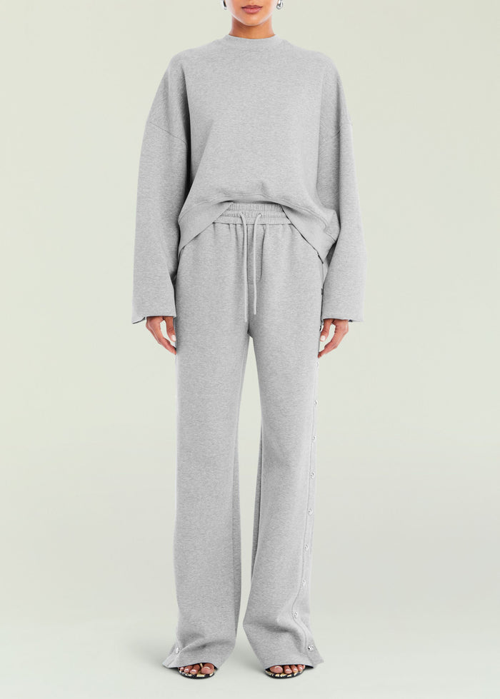 Wide leg drawstring sweatpants. Silver snap button hardware down each side. Pair with the Taley Sweatshirt to complete the look. Shown here in Heathered Grey.